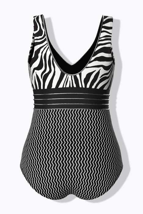Motif tigré noir & blanc, Dos extrêmement plongeant, Bonnets souples et bande de soutien sous la poitrine, Doublure poitrine douce et confortable, Contient du polyamide recyclé, plus respectueux de l'environnement