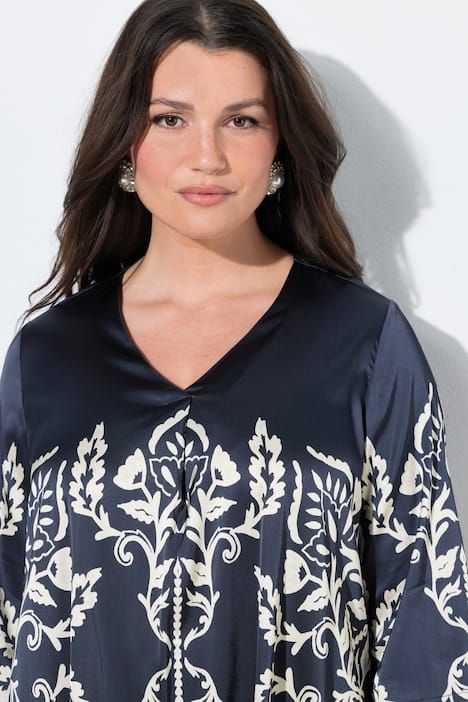 Ravissant motif à fleurs, Décolleté en V avec pli fantaisie, Coupe large et évasée, finition en pointes tendance, Manches 3/4 fendues, Viscose agréablement élastique, Long. selon taille env. 82-86 cm.