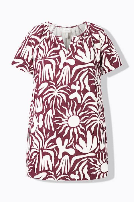 Motif feuilles tendance, Col tunisien avec fronces, Coupe évasée, base ample et confortable, Manches raglan, courtes et évasées, Coton bio durable, Long. selon taille env. 80-84 cm.