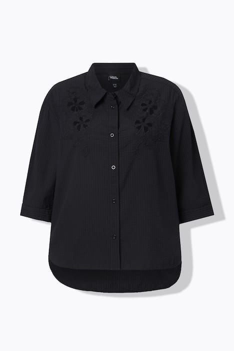 Chemisier en seersucker, broderies, col chemise et manches 3/4