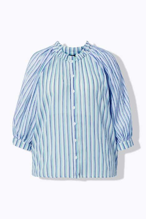 Motif à rayures tendance, Col montant avec ruché, Modèle oversize décontracté, Manches raglan 3/4 ultra-larges, avec poignets, Pur coton, Long. selon taille env. 68-76 cm.