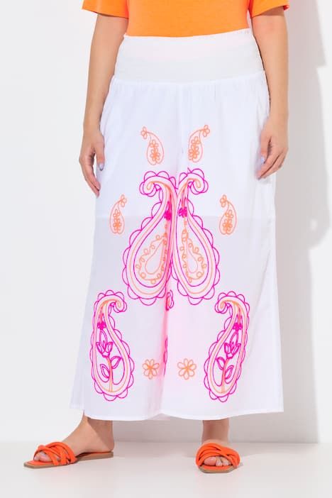Broderies fluo tendance, Modèle Rose, avec jambe droite ultra-large, Taille élastique smockée très large, Deux poches sur les côtés, Pur coton, Long. selon taille env. 60 cm.