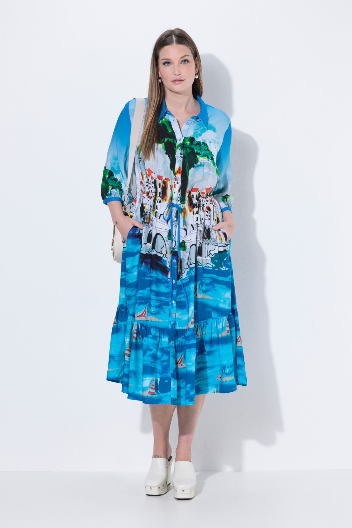 Motif vacances estivales, Modèle classique avec col chemise et patte de boutonnage, Coupe évasée, cordon de serrage coulissant sous tunnel à la taille, Manches 3/4 avec manchettes, Viscose douce et confortable, au tombé fluide