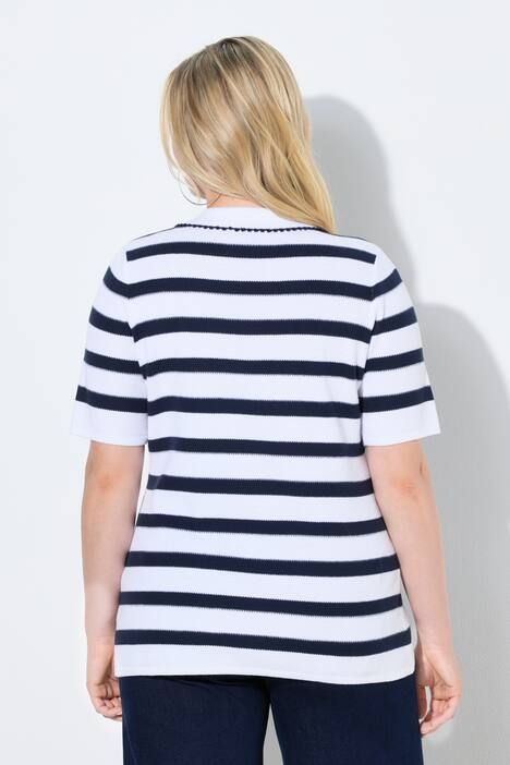 Maille douce, confortable et élégamment texturée, motif à rayures, Col polo avec décolleté en V arrondi et liseré fantaisie, Coupe près du corps, Manches courtes, Pur coton, Long. selon taille env. 68-76 cm.