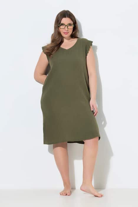 Mousseline douce, confortable et élégamment texturée, broderies ajourées sur les manches, Décolleté en V, Manches très courtes, avec ruchés aux extrémités, Base large et confortable, Coton respirant, idéal pour la nuit, Long. env. 100-105 cm.