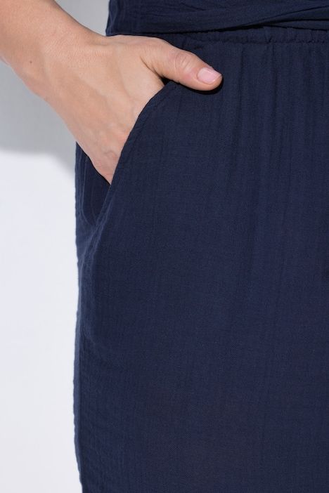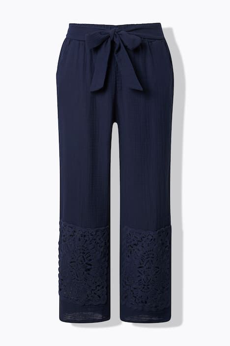 Large bordure en crochet sous le genou, Coupe Marlène, jambe droite et large, Taille élastique avec ceinture à nouer, Poches fendues, Coton bio durable, Entrej. env. 78 cm.