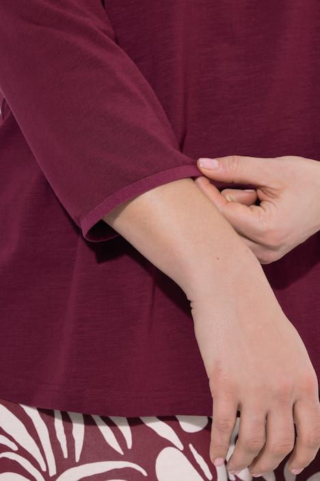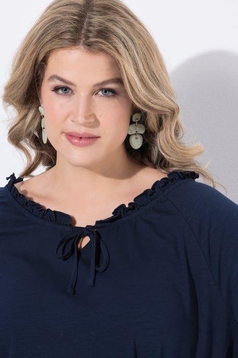 Encolure Carmen, avec fronces et ruché, Fente et petit cordon à nouer sur le devant, Coupe évasée, base ample et confortable, Manches 3/4 raglan avec extrémités élastiques, Coton bio durable, Long. selon taille env. 58-66 cm.