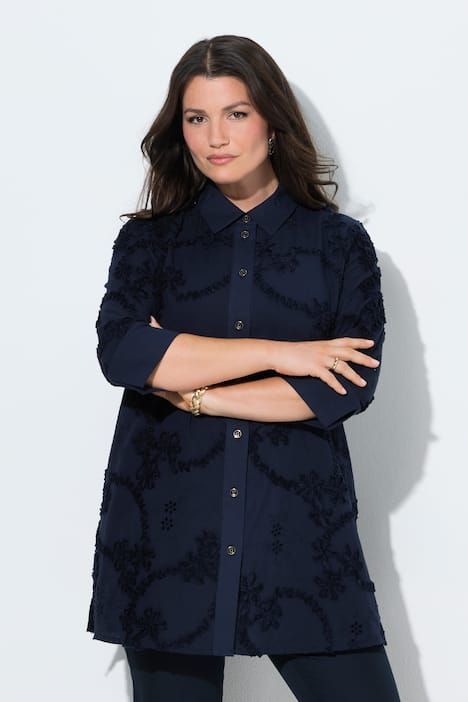 Chemisier long avec broderies, col chemise et manches 3/4