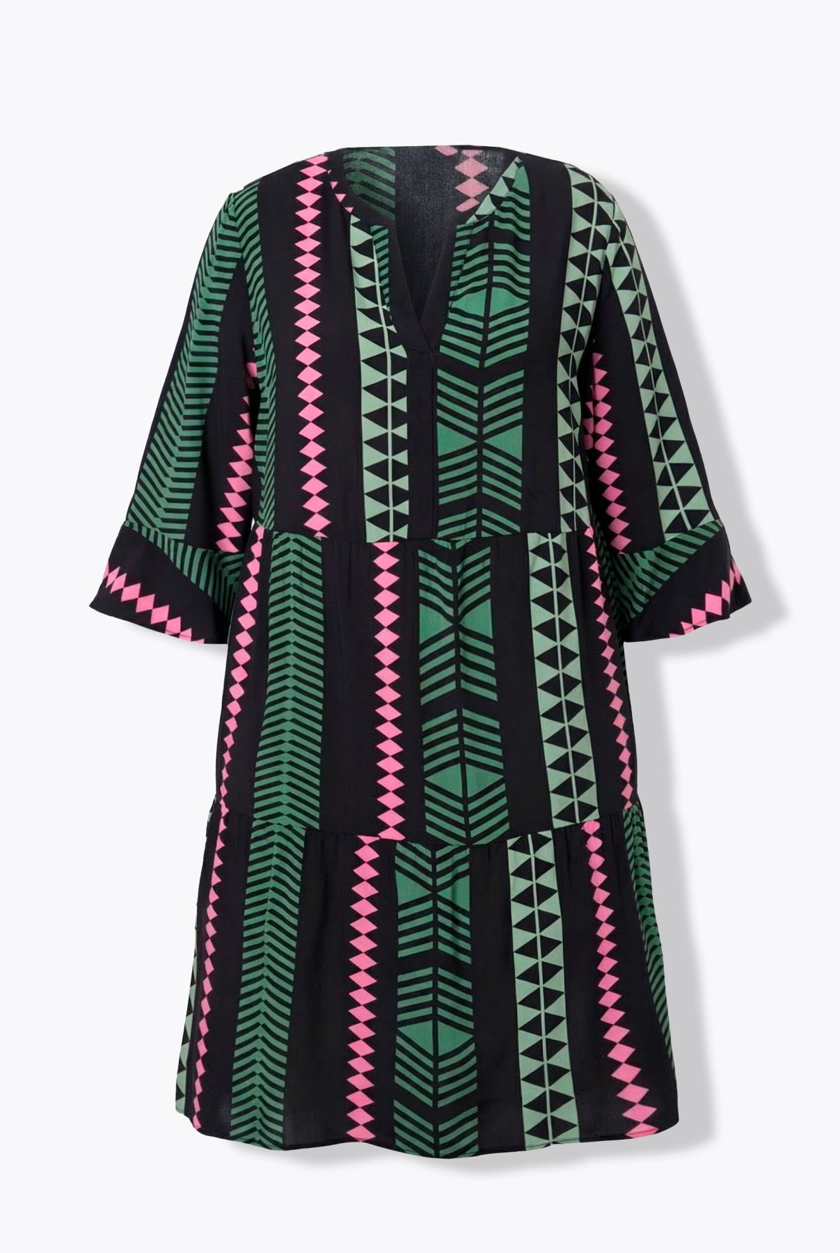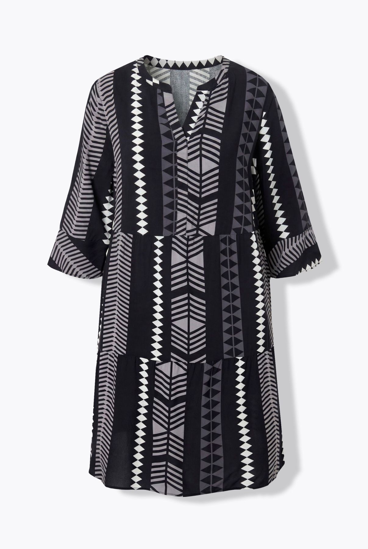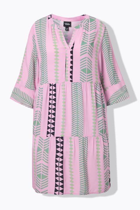 Imprimé graphique tendance, Col tunisien très féminin, Coupe évasée courte, deux niveaux de volants, Manches 3/4 se terminant par un joli volant, Viscose douce et confortable, au tombé fluide, Long. env. 100-104 cm.