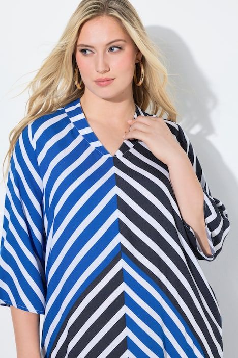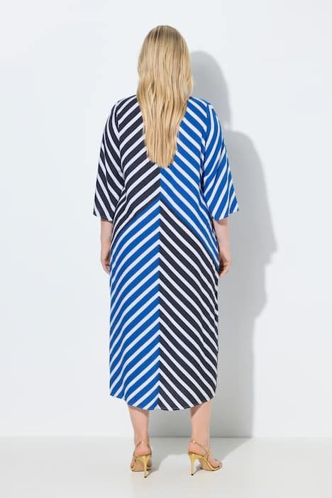 Tissu doux et confortable, jeu de rayures colorées, Col calice avec décolleté en V, Coupe confortable, profonde fente de chaque côté, Manches 3/4 trompette, Viscose douce et confortable, au tombé fluide, Long. env. 126 cm.