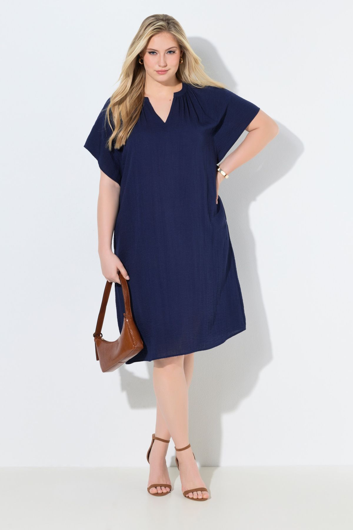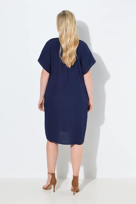 Matière douce, confortable et raffinée, aspect lin, Col tunisien avec fronces, Coupe oversize courte, Poches latérales réservées dans la couture, Manches courtes chauve-souris, Long. env. 106-110 cm.