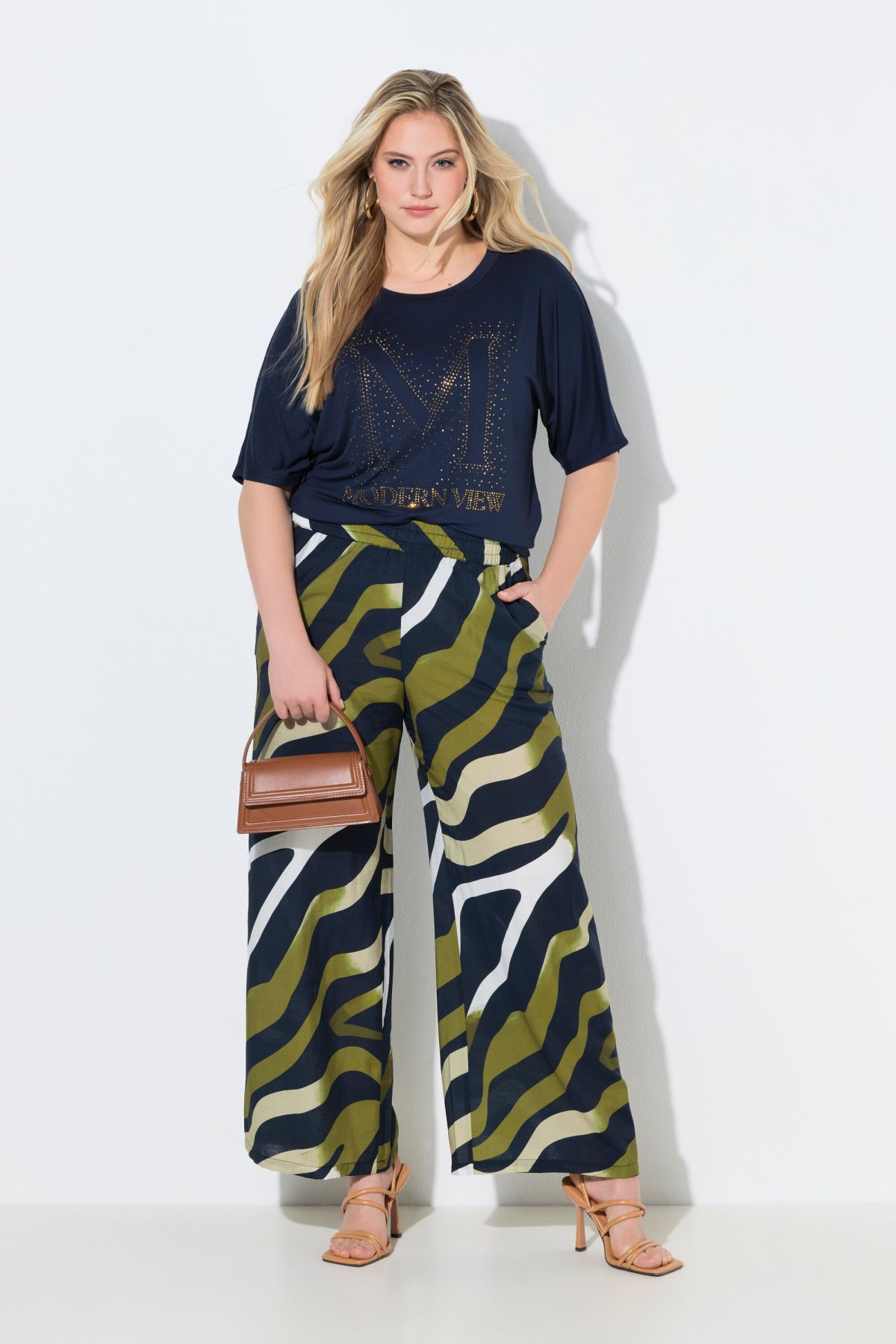Motif zébré tendance, Modèle Rose, jambe droite et large, Taille élastique confortable, Poches fendues sur les côtés, Viscose au tombé fluide, Entrej. env. 78 cm.