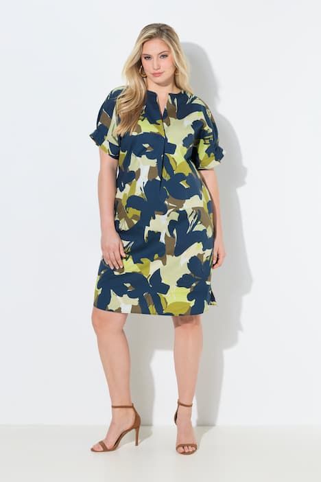 Imprimé floral abstrait, Col tunisien avec pli fantaisie, Coupe oversize décontractée, avec poches latérales réservées dans la couture, Manches courtes, plis fantaisie, Coton naturel enrichi en élasthanne, Long. env. 100-104 cm.