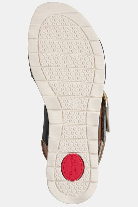 Cuir véritable haut de gamme, Large bride avant, ajustable par fermeture à scratch, Bride arrière ajustable à l'aide d'une boucle, Semelle de propreté ergonomique et amovible, Semelle flexible en caoutchouc, avec talon compensé d'env. 3,9 cm.