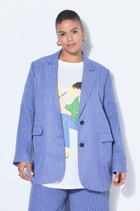 Coupe oversize, Bandes pailletées, Col à revers, Poches à rabat, Doublure intégrale, Long. selon taille env. 80-84 cm.