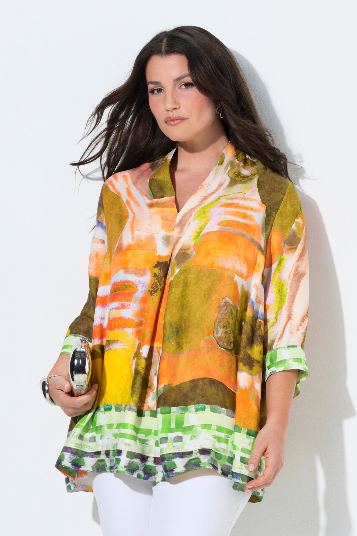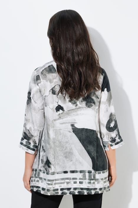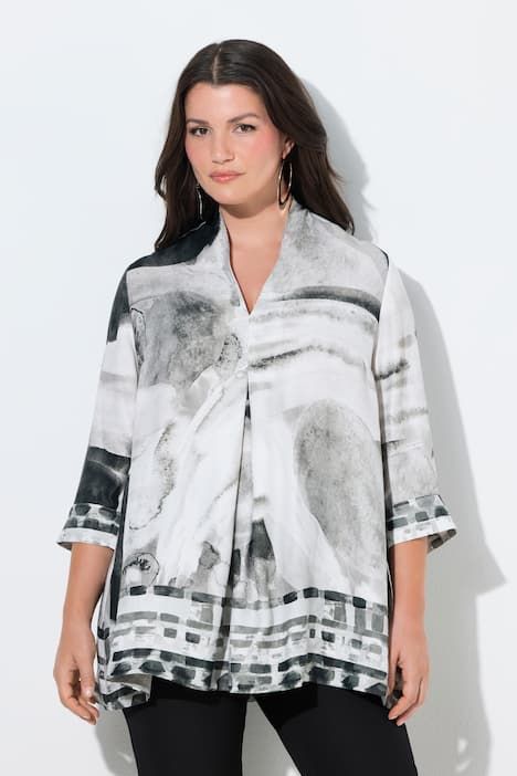 Motif tendance, avec jolies bordures fantaisie, Col calice avec décolleté en V et pli d'aisance, Coupe évasée, base ample et confortable, Manches 3/4 fendues, Satin de viscose délicatement brillant, Long. selon taille env. 74-78 cm.