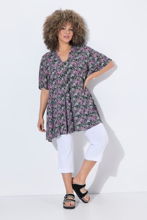 Imprimé abstrait tendance, Décolleté carré, Coupe fortement évasée, couture arrondie et jolis plis fantaisie, Manches chauve-souris courtes et amples, Viscose douce et confortable, au tombé fluide, Long. selon taille env. 81-85 cm.