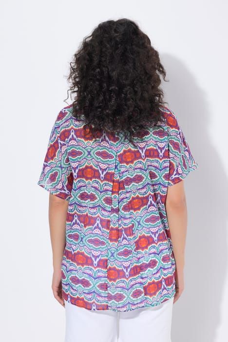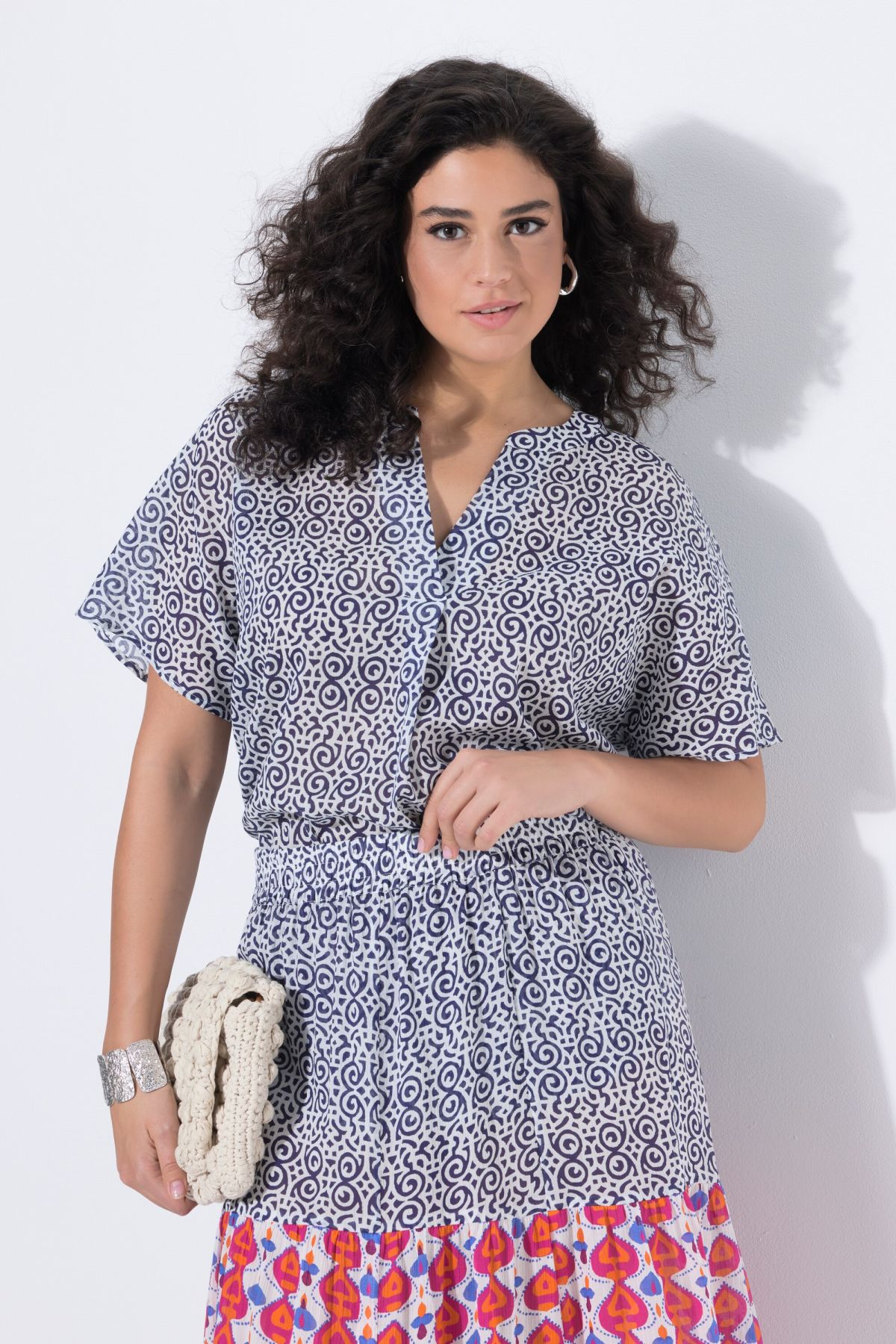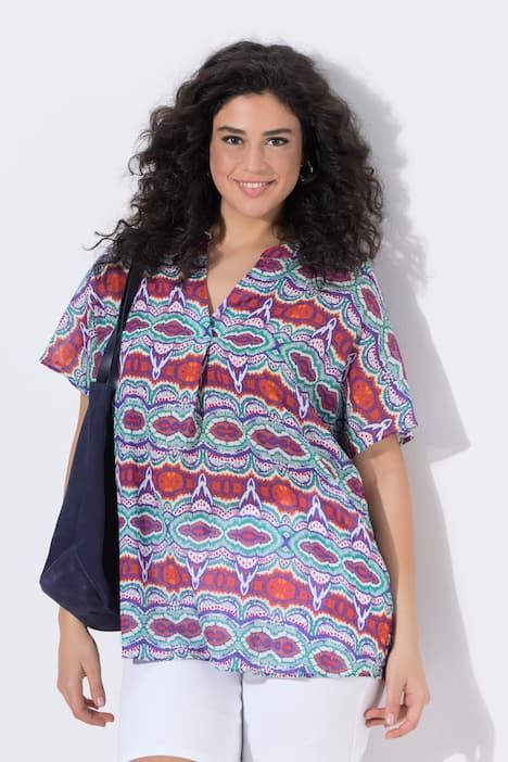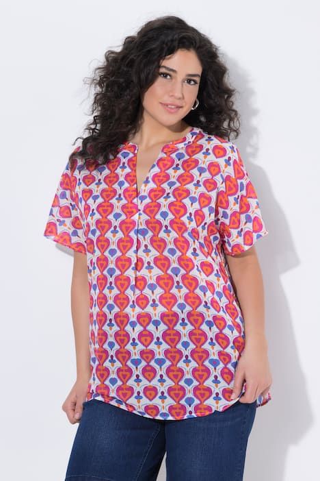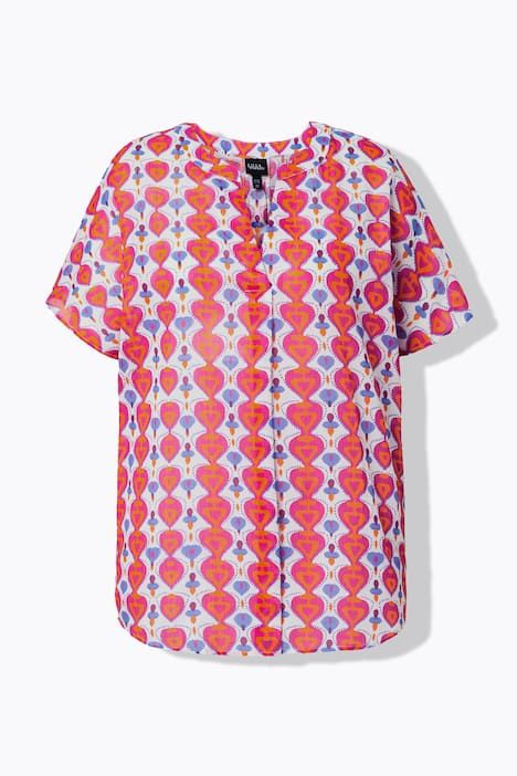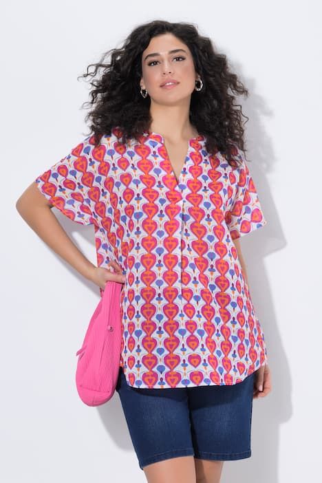 Imprimé tendance, Col très légèrement montant, décolleté en V et pli fantaisie, Coupe évasée et confortable, avec épaules basses, Manches courtes, Pur coton, Long. selon taille env. 70-78 cm.