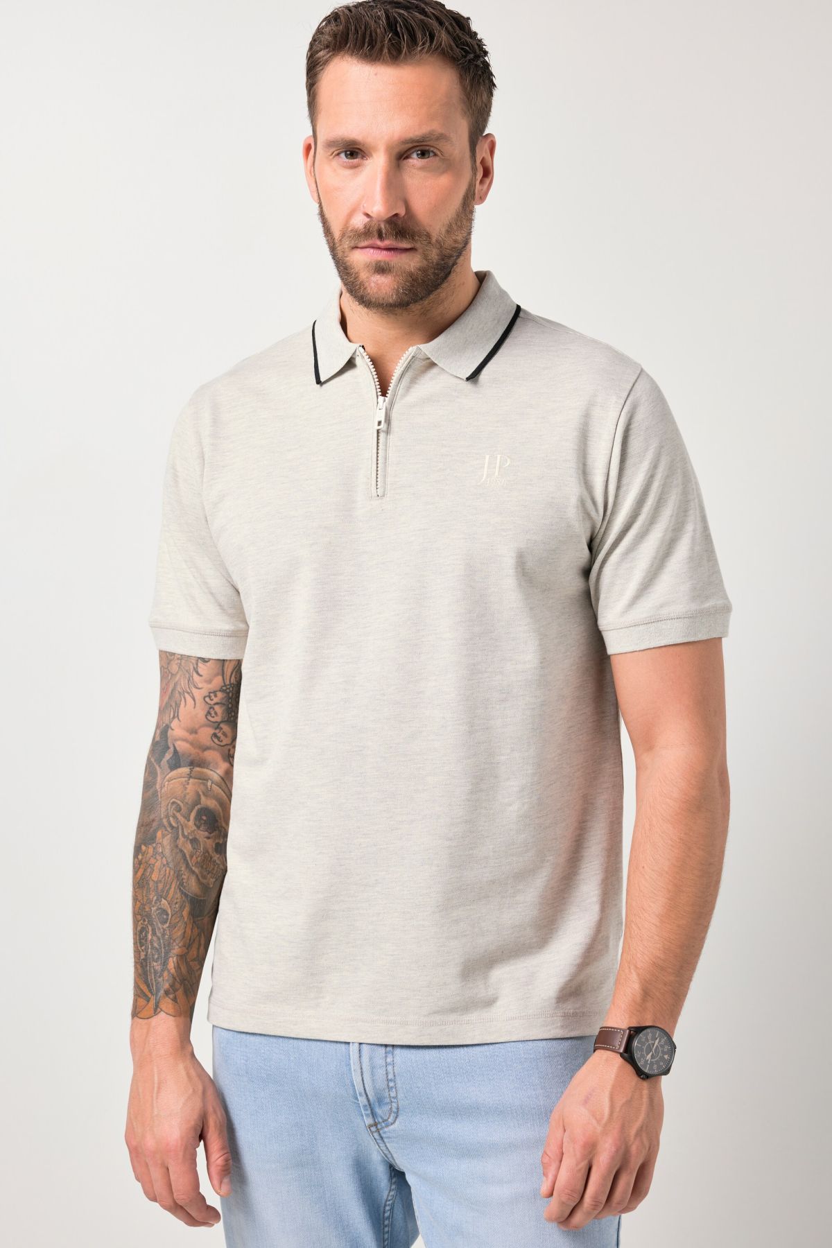 Coupe spéciale jusqu'au 8 XL, Technologie FLEXNAMIC®, Liberté de mouvement et flexibilité maximales, Maille piquée chinée, finement texturée et respirante, Col polo avec fermeture zippée, Long. selon taille env. 74-86 cm.