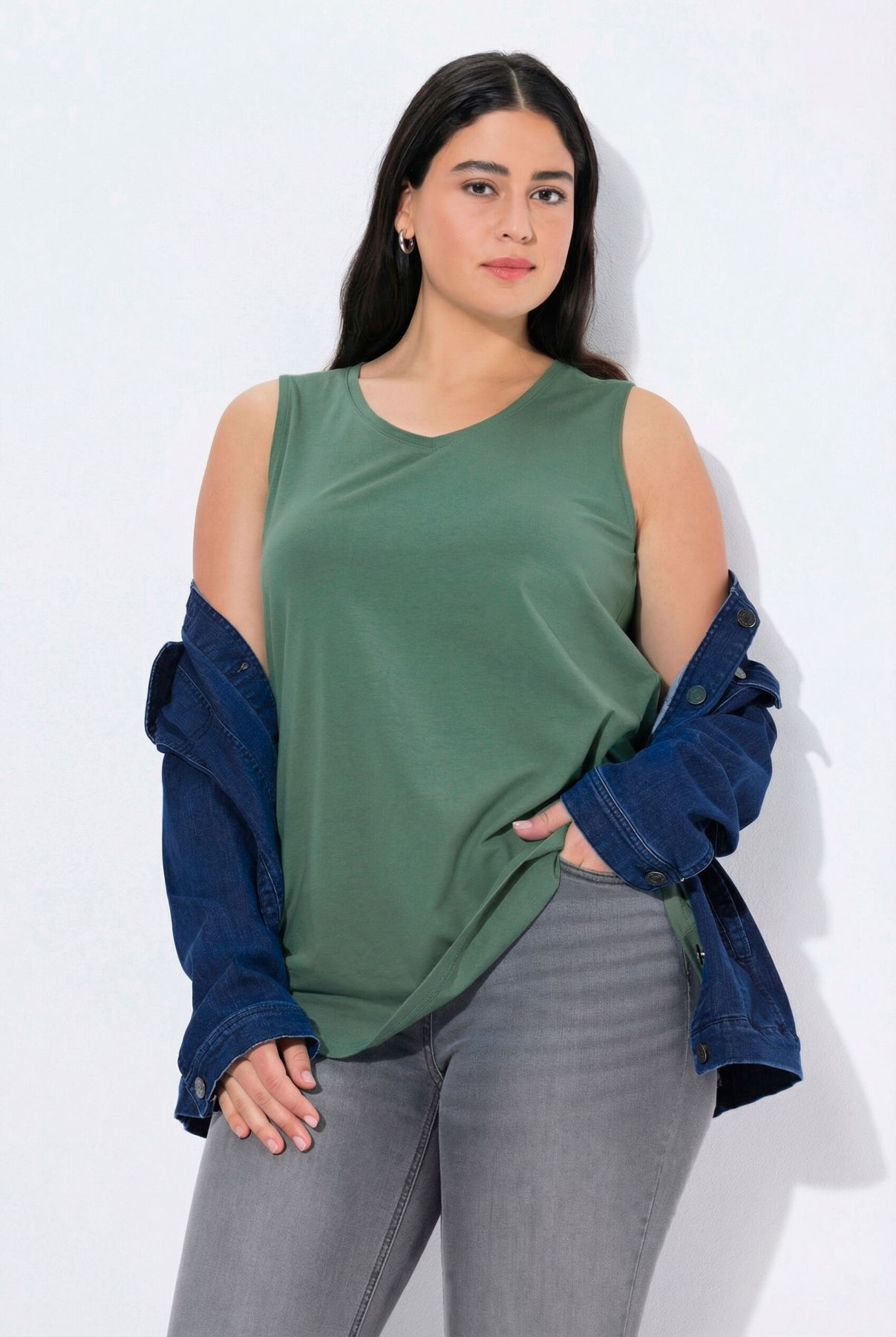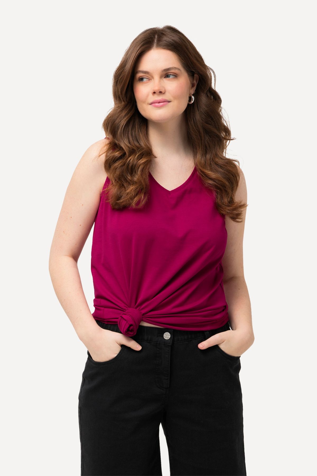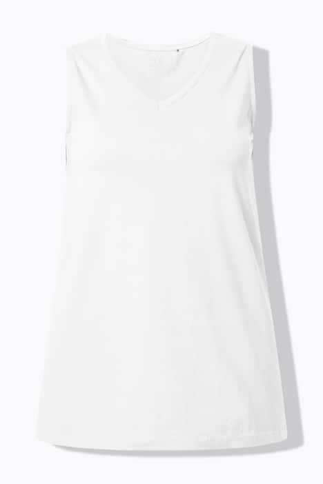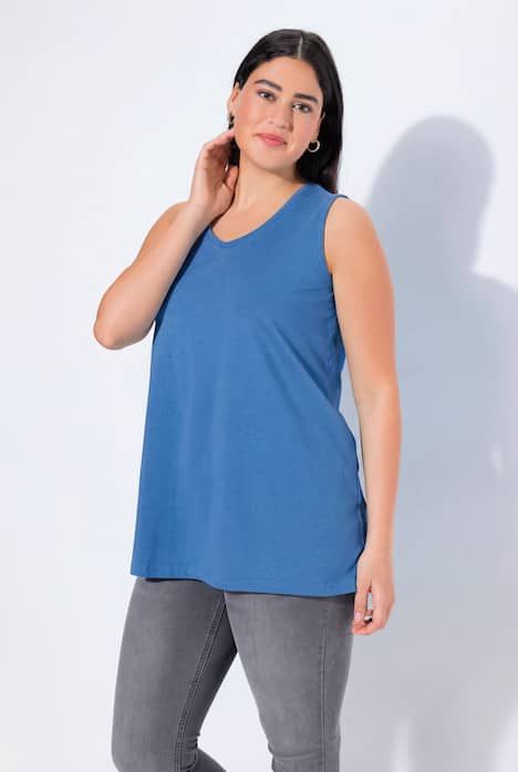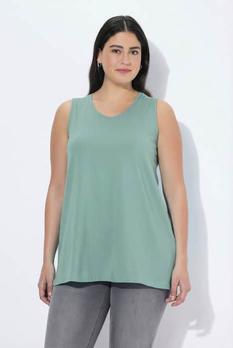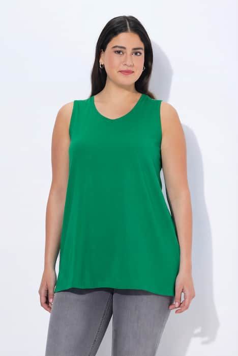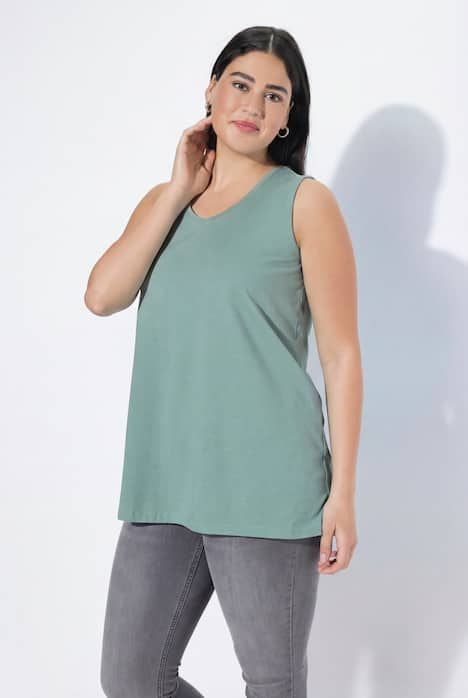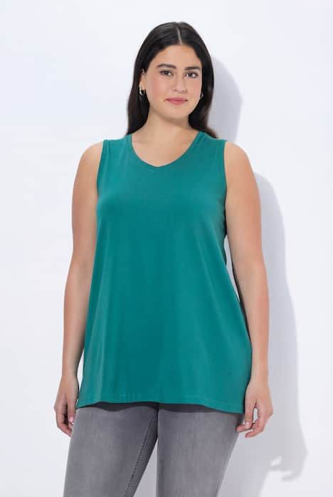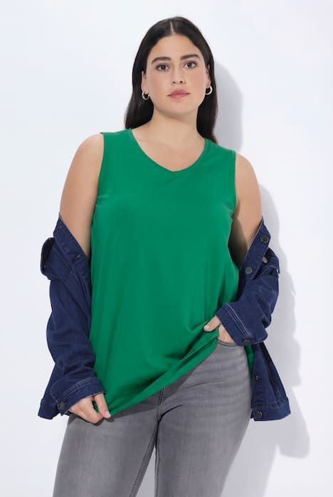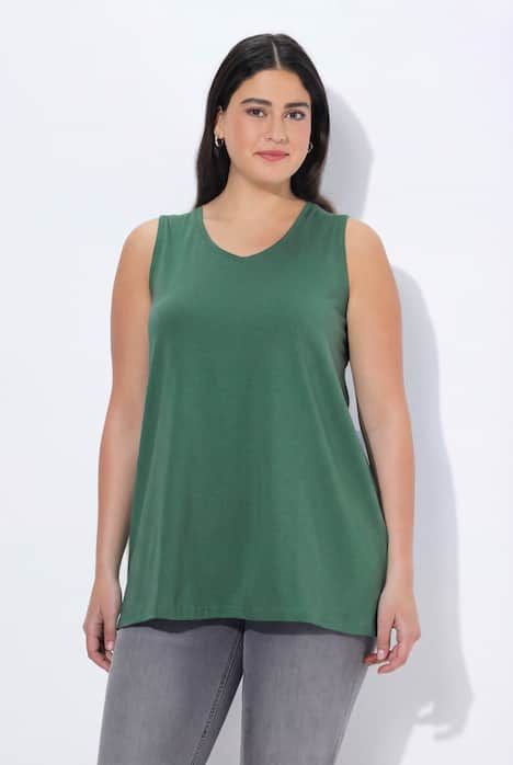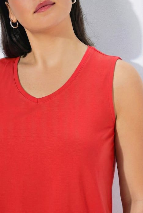 Le top Basic, ligne A, encolure V.& 10;<br>Le cœur « C’EST BIEN – CONTINUONS » indique que le vêtement est réalisé en partie ou entièrement de façon durable ou particulièrement testé aux substances nocives.& 10;<br>