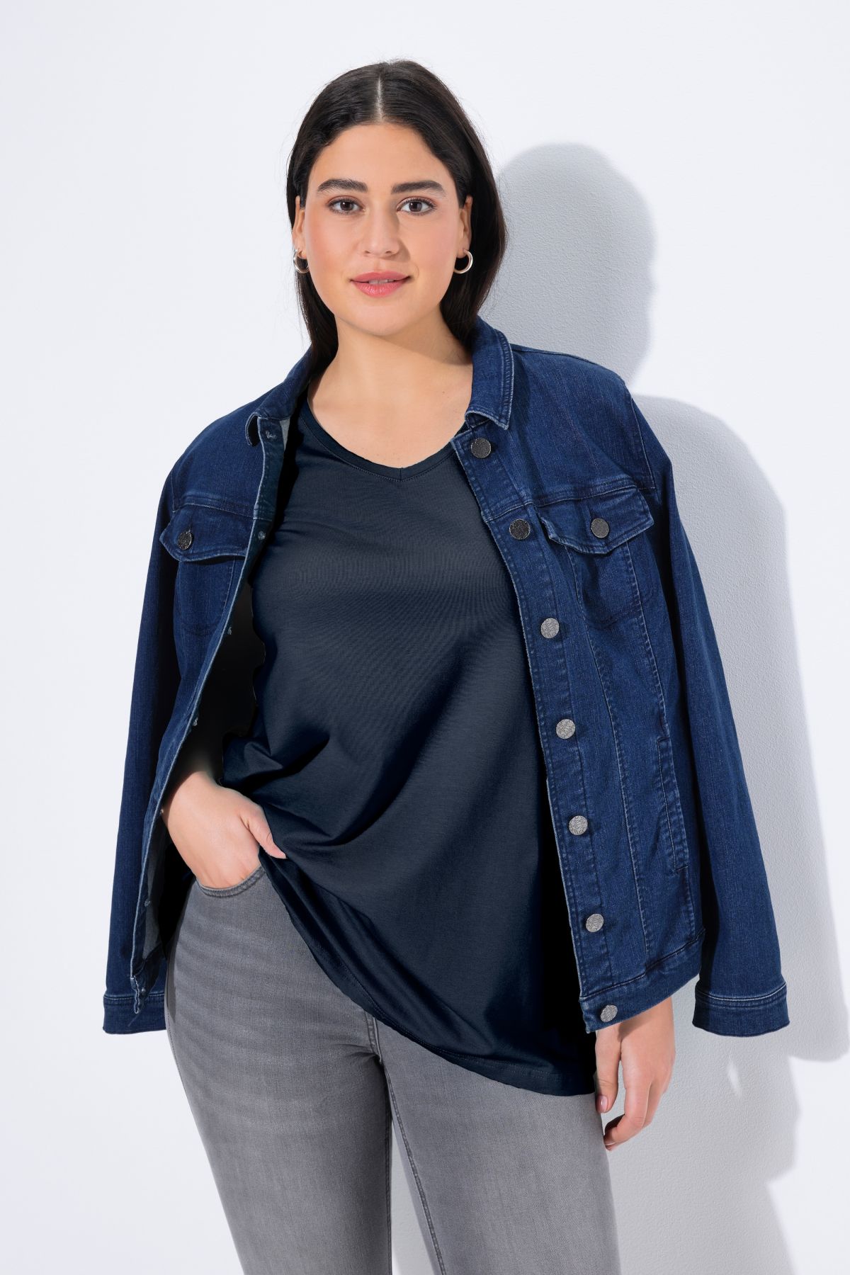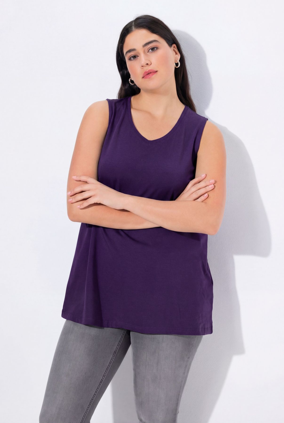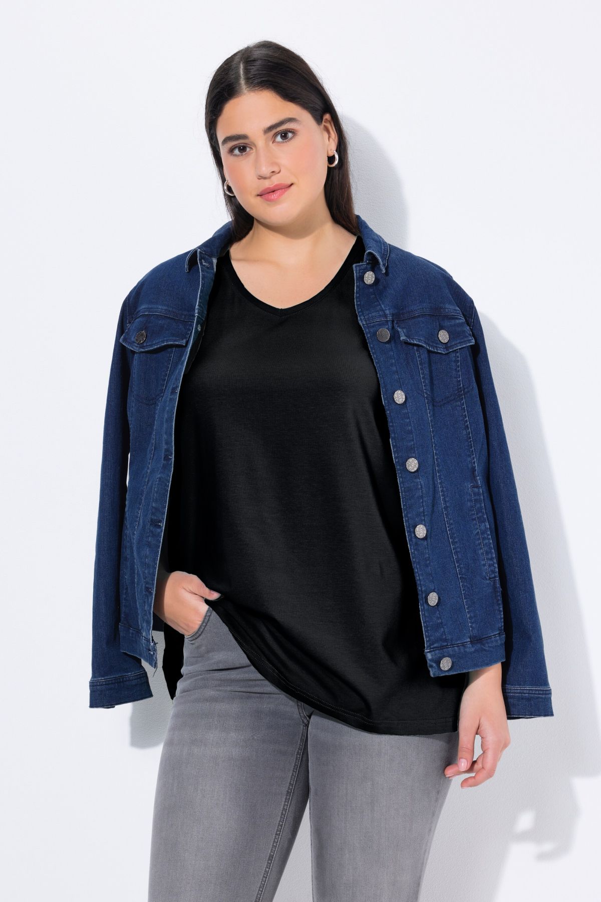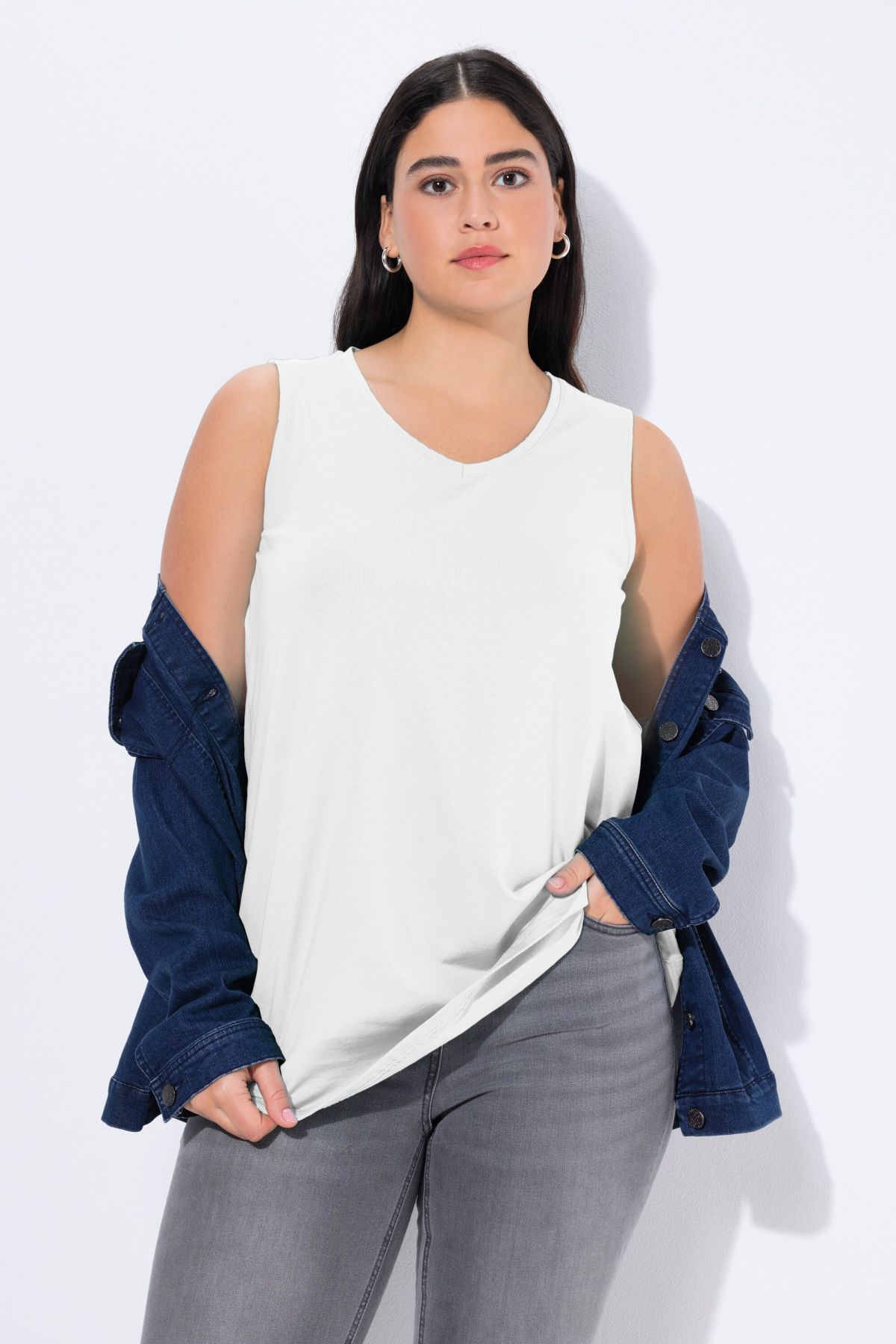 Le top Basic, ligne A, encolure V.& 10;<br>Le cœur « C’EST BIEN – CONTINUONS » indique que le vêtement est réalisé en partie ou entièrement de façon durable ou particulièrement testé aux substances nocives.& 10;<br>