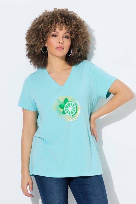 Motif citrons fantaisie, Encolure en V arrondi, Coupe évasée, base ample et confortable, Manches courtes, Coton naturel enrichi en élasthanne, Long. selon taille env. 68-76 cm.
