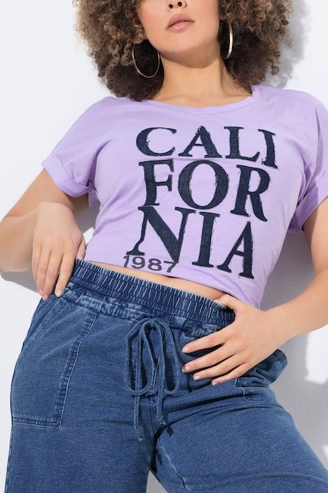 Teinture indigo haut de gamme, pour un style « used look » tendance, Modèle Rose, jambe droite et large, Taille élastique avec cordon de serrage, 2 poches plaquées, Bas de jambe avec revers et attache, Jersey doux et confortable, en pur coton, Entrej. env
