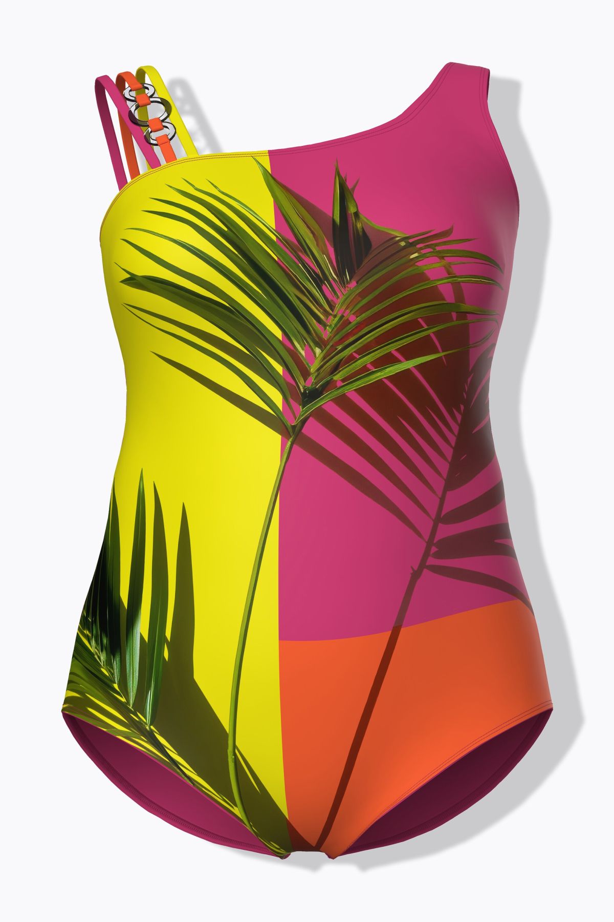 Motif palmier tendance, esprit « colour block », Bretelles triples avec anneaux fantaisie sur l'épaule droite, Bonnets souples et bande de soutien sous la poitrine, Doublure poitrine douce et confortable, Contient du polyamide recyclé, plus respectueux de