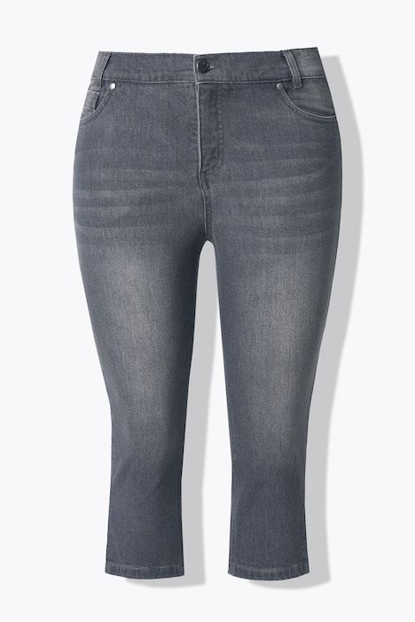 Denim extensible, doux et confortable, Longueur corsaire sportive, Jambe étroite, fendue à la base, Coupe 5 poches confortable, Passants pour ceinture, bouton et fermeture à glissière, Entrej. env. 49 cm.