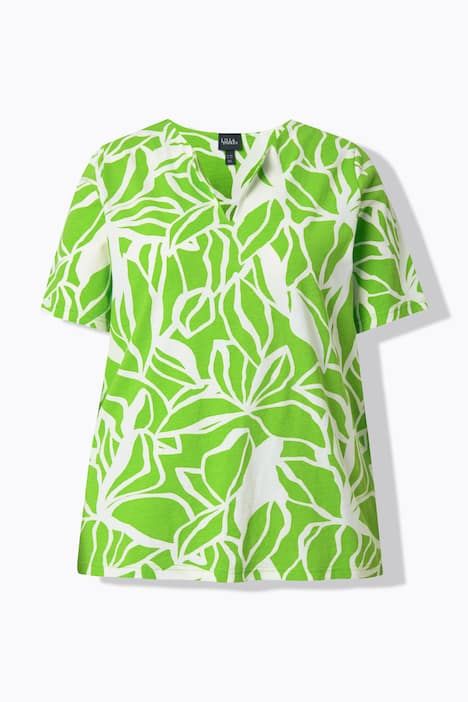 Motif feuilles fantaisie, bicolore, Décolleté en V « rabattu », Coupe confortable, Manches courtes, Pur coton, Long. selon taille env. 68-76 cm.