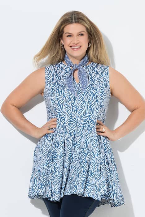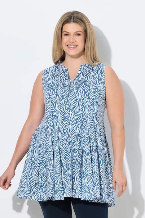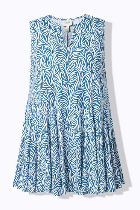 Motif floral abstrait, Col tunisien très féminin, Base fortement évasée avec plis godet, Modèle sans manches, Coton bio durable, Long. selon taille env. 82-86 cm.