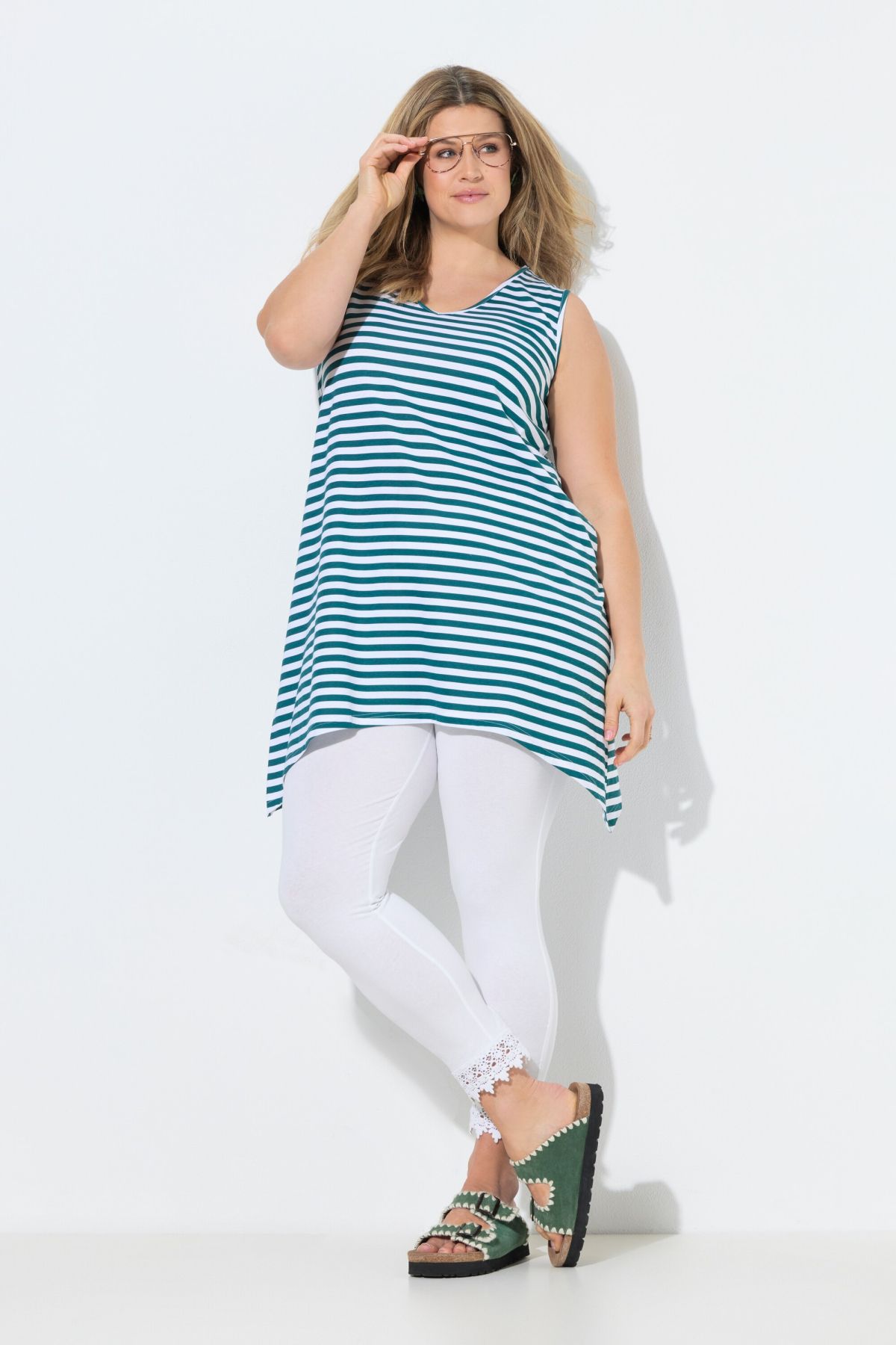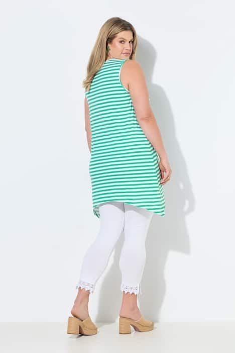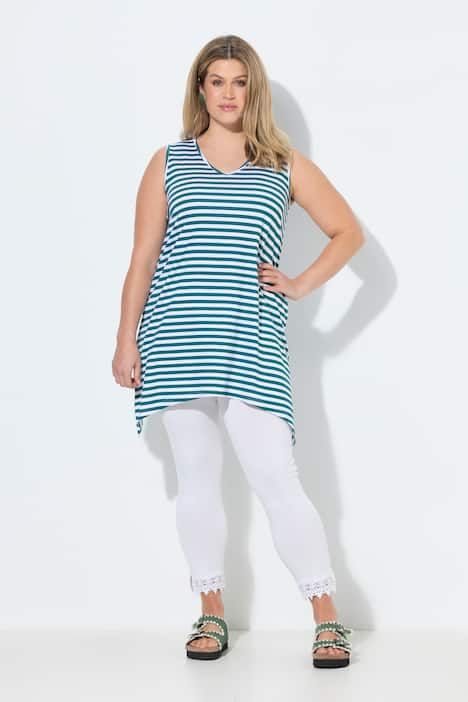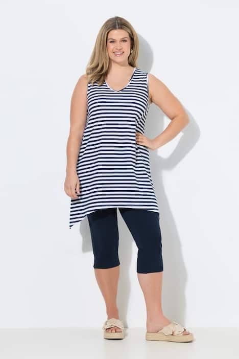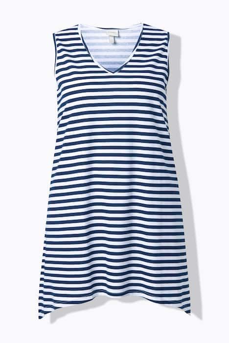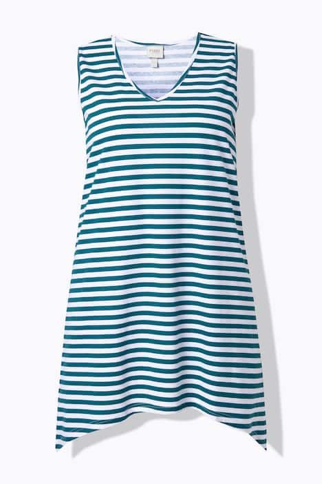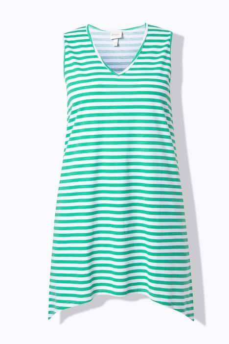 Rayures tendance, Décolleté en V arrondi, Coupe évasée confortable, base en pointe de chaque côté pour un style décontracté, Modèle sans manches, Coton bio durable, Long. selon taille env. 82-86 cm.