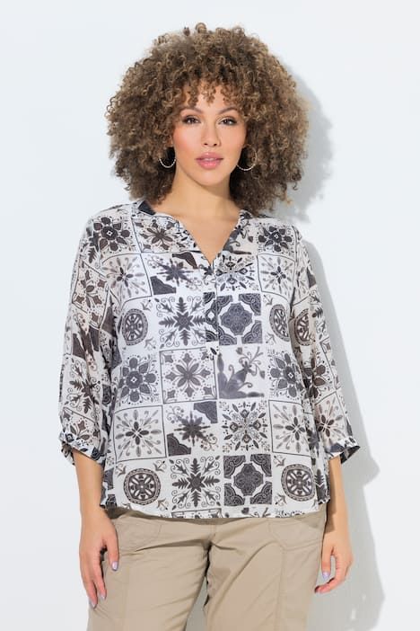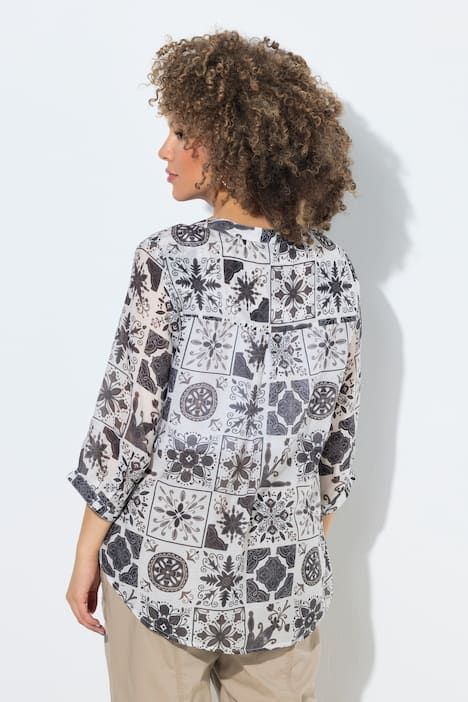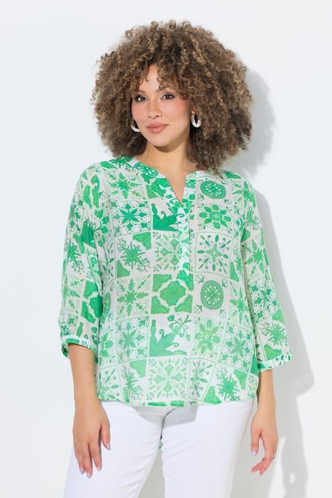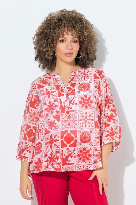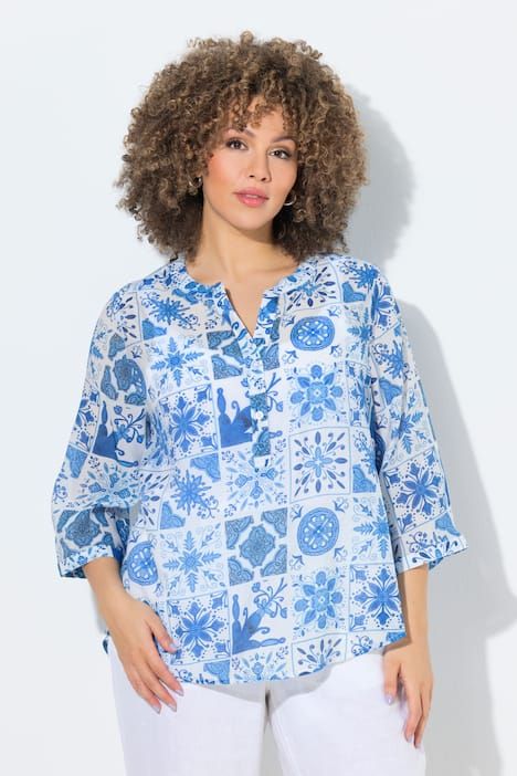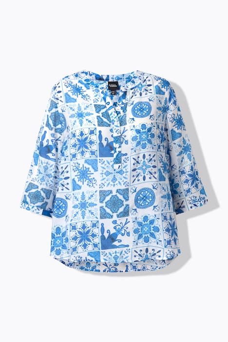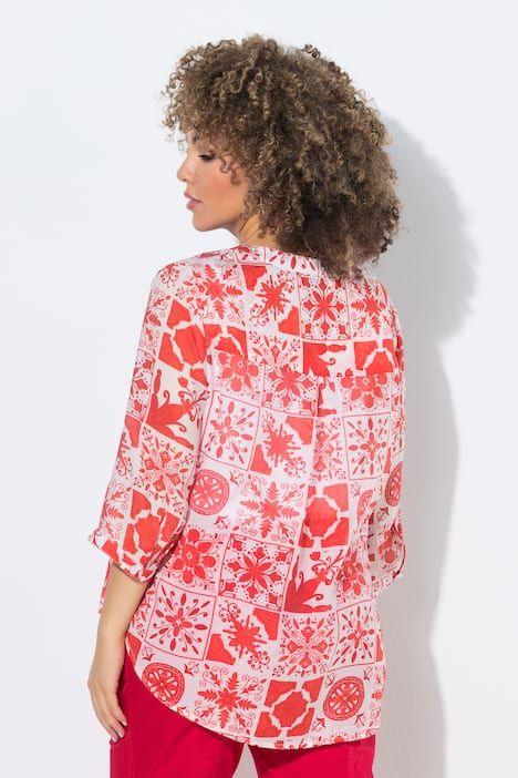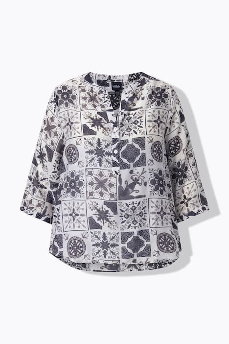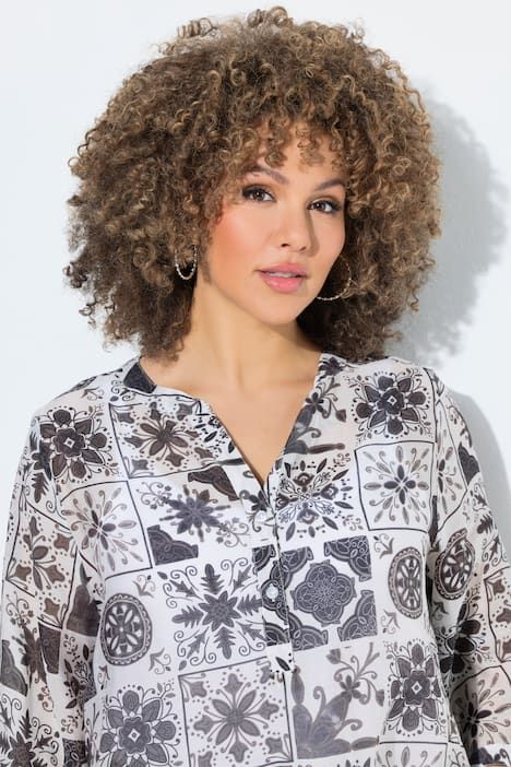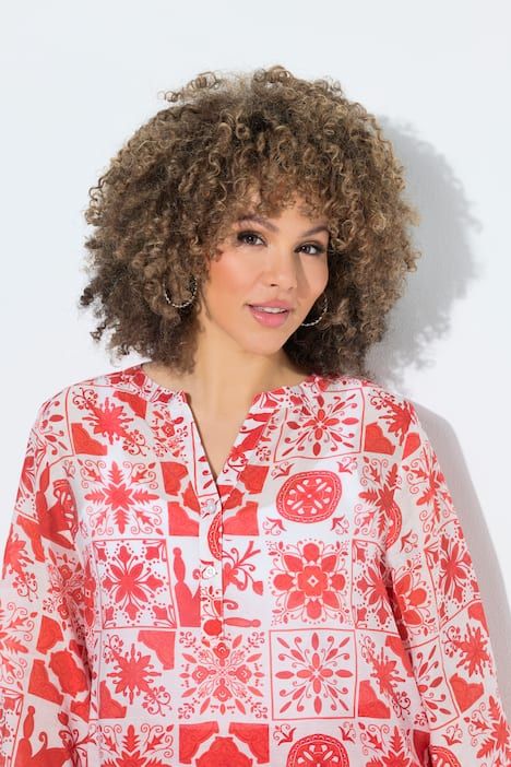 Ravissant motif mosaïque, Col tunisien avec courte patte de boutonnage, Base arrondie, env. 4 cm plus longue dans le dos, Manches 3/4 avec manchettes, Mélange viscose-coton naturel, Long. selon taille env. 72-76 cm.