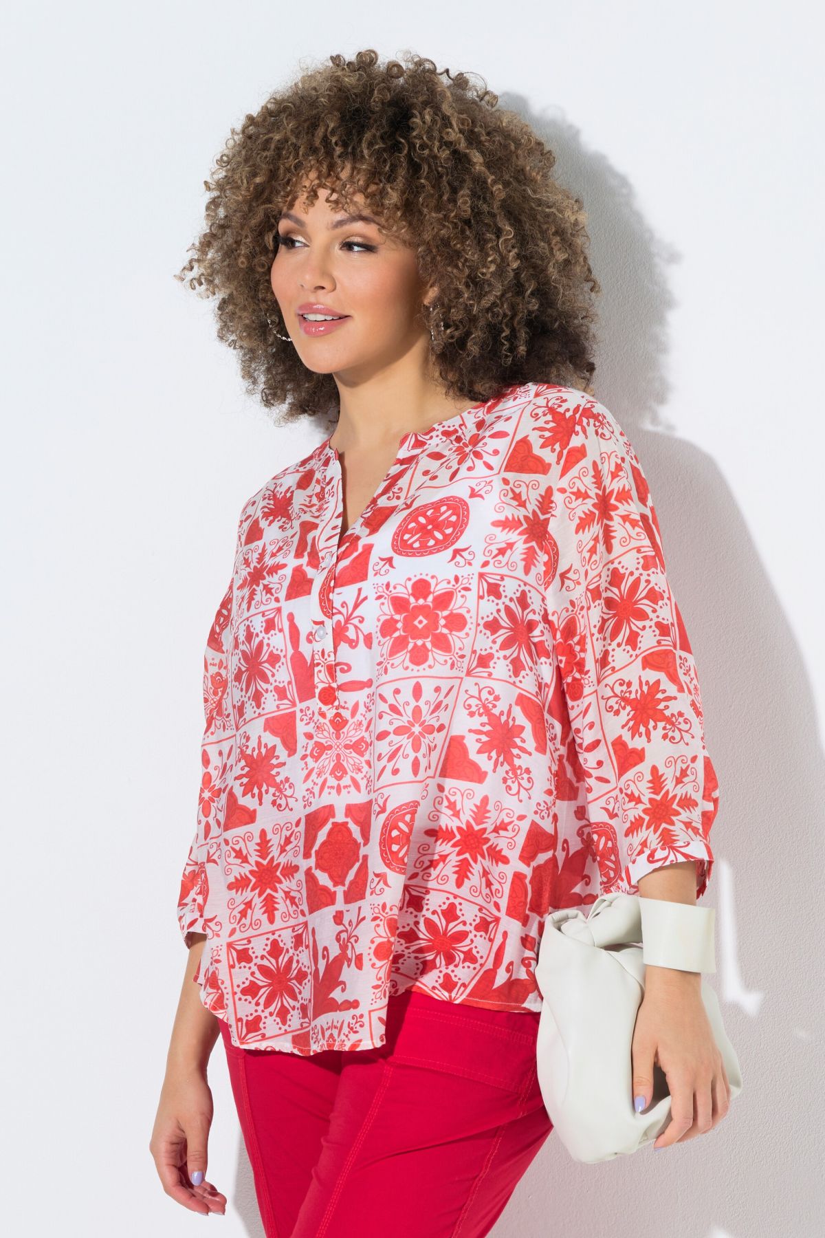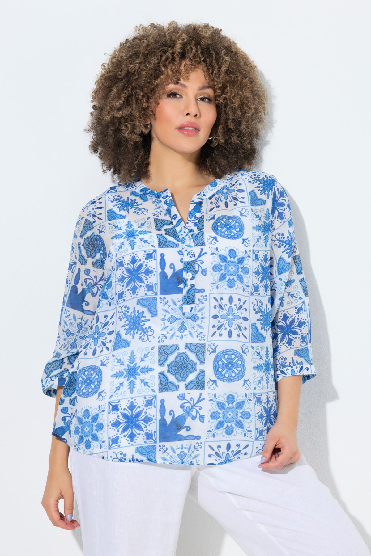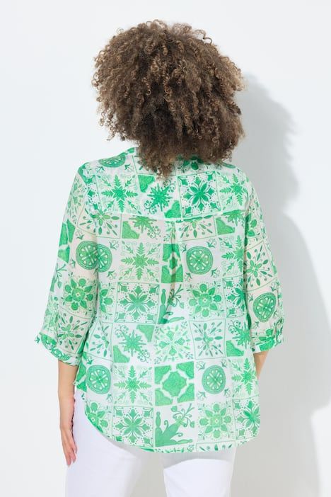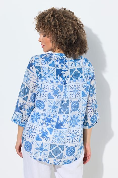 Ravissant motif mosaïque, Col tunisien avec courte patte de boutonnage, Base arrondie, env. 4 cm plus longue dans le dos, Manches 3/4 avec manchettes, Mélange viscose-coton naturel, Long. selon taille env. 72-76 cm.
