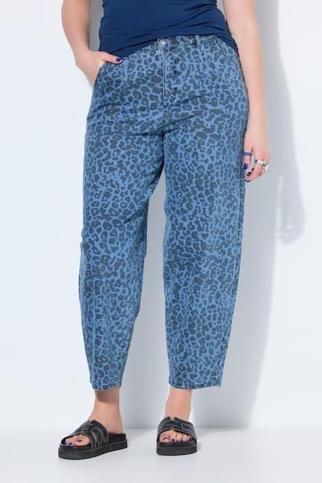Coupe ballon ample, taille haute, Denim stretch imprimé léopard, 5 poches, Taille élastique avec passants pour ceinture, Entrej. env. 74 cm.