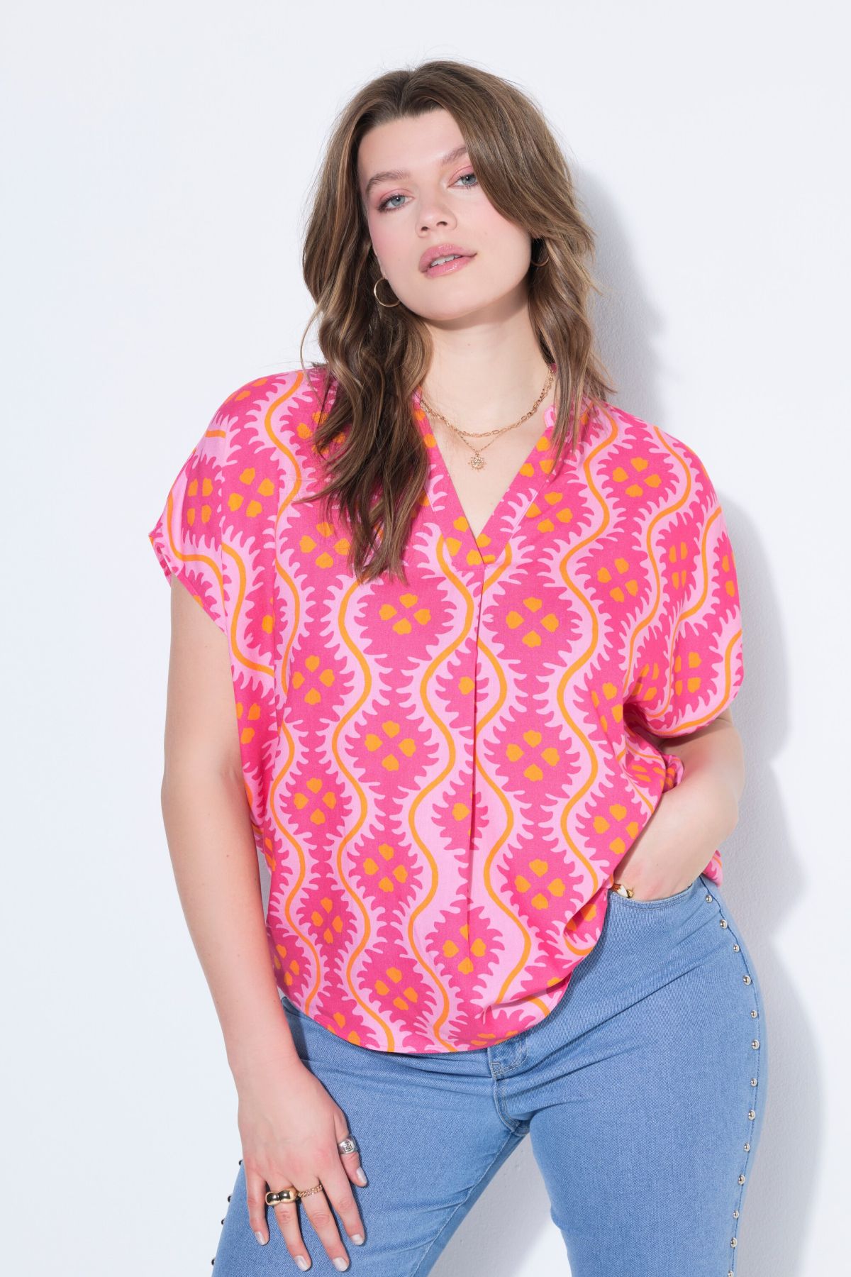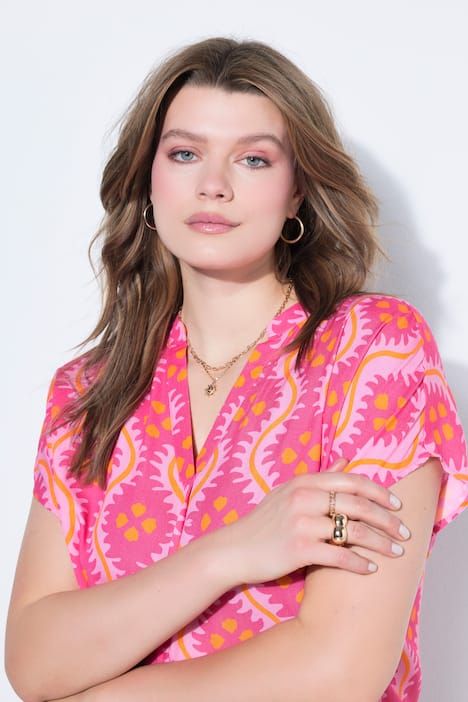Coupe oversize, Imprimé intégral, Col en V, Ourlet arrondi, Long. entrej. env. 74-78 cm.