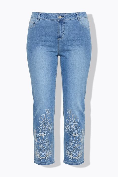 Coupe mom confortable, Denim extensible, 5 poches, Broderie à l'ourlet, Taille avec passants pour ceinture, Entrej. env. 74 cm.