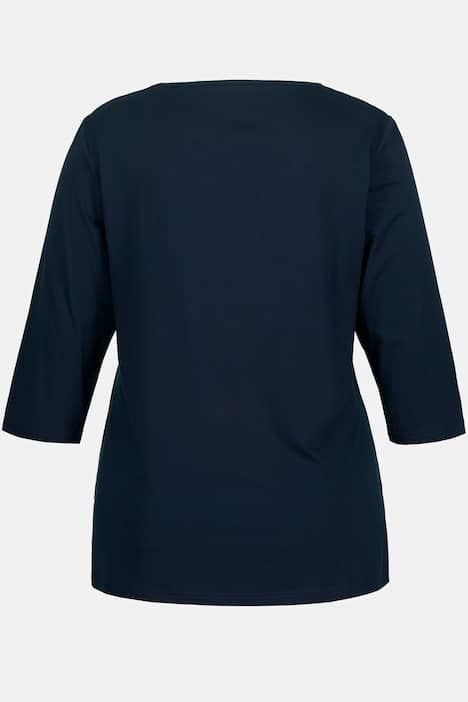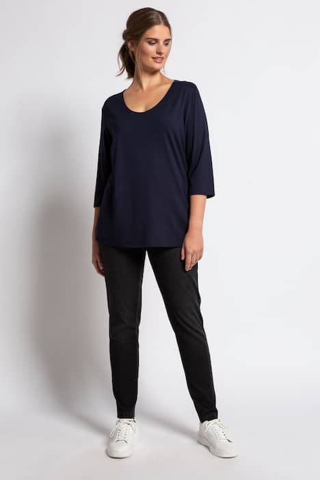 Le T-shirt simple pour tous les jours ou assorti pour une tenue plus classe. Il est en crêpe et le devant est entièrement doublé. L´encolure est ronde pour un magnifique décolleté - les manches sont 3/4. Coupe : slim.& 10;<br> selection-Highlight: Le devant est entièrement doublé. Le dessus a un tombé lisse et sans plis. Effet stylé garanti.& 10;<br> Les manches 3/4 affinent le bras et soulignent les poignets. Petites fentes sur les côtés.& 10;<br> Textile contrôlé et certifié selon le standard OEKO-TEX Standard 100, numéro de contrôle : 14.0.49629.& 10;<br>  & 10;<br>  & 10;<br> Mode haut de gamme pour vous ! & 10;<br>Selection by Ulla Popken - la ligne haut de gamme avec style et élégance ! selection by Ulla Popken transforme les classiques en pièces phares contemporaines, réalisées dans des matières de haute qualité, de beaux imprimés et agrémentées de petits détails – une mode parfaite au quotidien et pour les occasions spéciales. & 10;<br>Chaque modèle offre un savoir-faire inégalé en matière d'ajustement, des matériaux de la plus haute qualité et des techniques de traitement sophistiquées. & 10;<br>& 10;<br>Le cœur „C’EST BIEN – CONTINUONS“, indique que le vêtement est en partie ou même entièrement fabriqué de façon durable.& 10;<br>