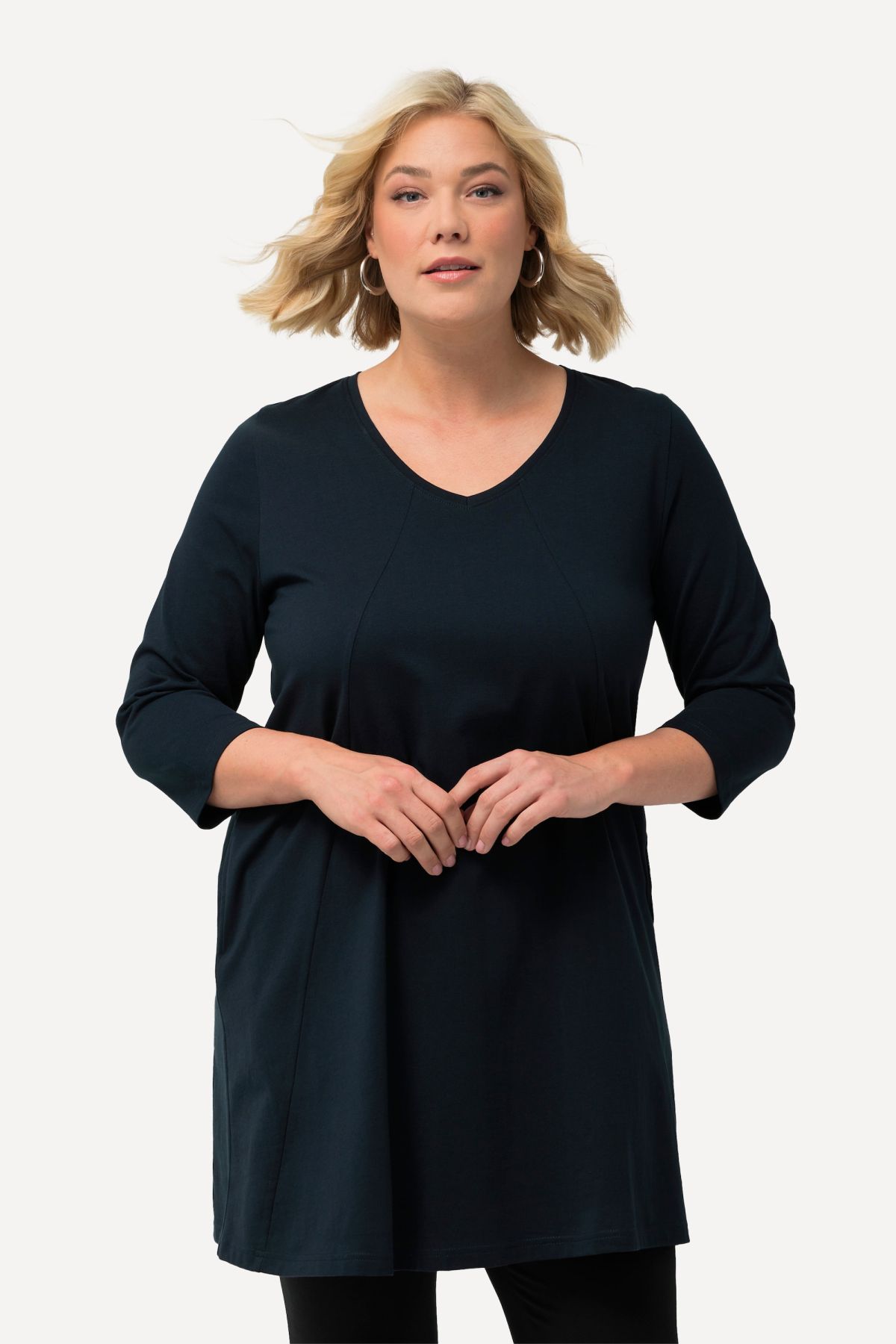 Coutures fantaisie, Décolleté en V, Coupe évasée, base ample et confortable, Manches 3/4, Pur coton, Long. env. 86