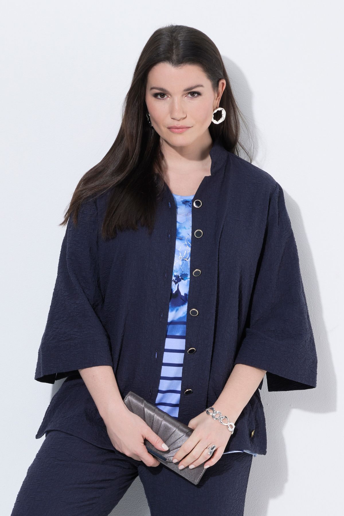 Veste texturée, manches 3/4 et col montant, coupe évasée
