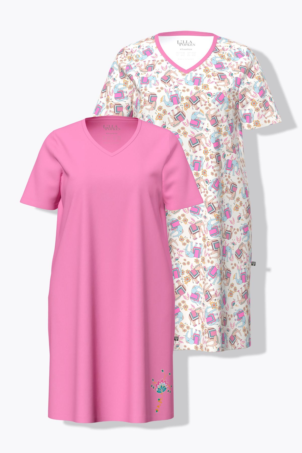 1x modèle de couleur unie, avec petite fleur à la base, 1x modèle avec motif éléphants, Décolleté en V, Coupe confortable, fentes sur les côtés, Coton respirant, idéal pour la nuit, Long. env. 100-105 cm.