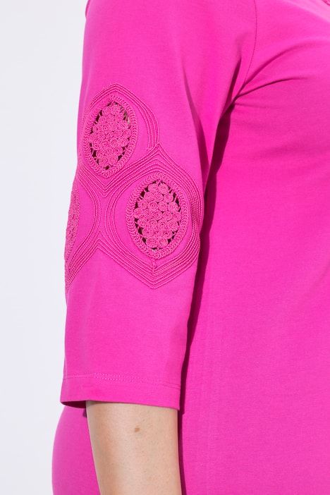 Décolleté rond avec broderies, Coupe plus longue que la normale, Base large et confortable, Manches 3/4, Pur coton, Long. selon taille env. 81-85 cm.