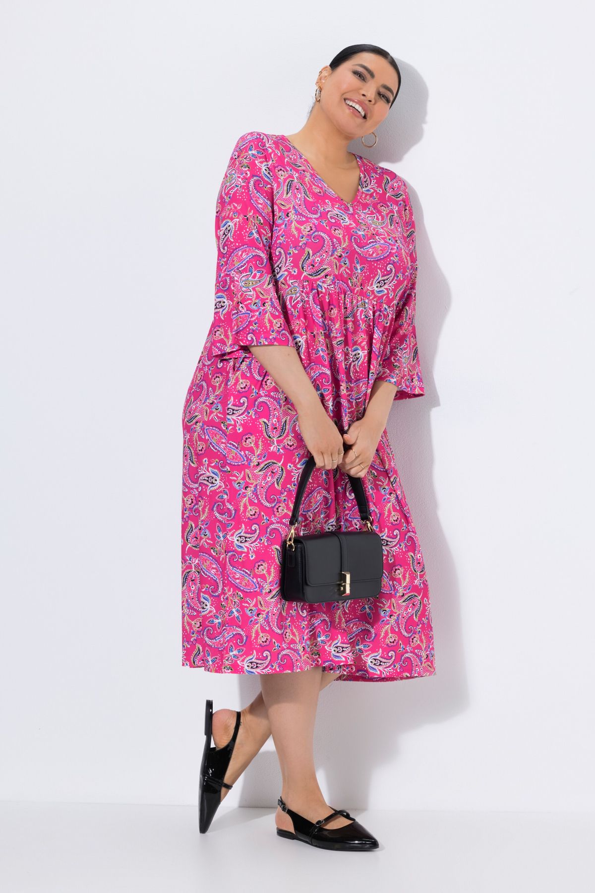 Tissu jersey particulièrement lisse, superbe motif cachemire, Décolleté en V, Coupe évasée confortable, couture empire élastique, Manches 3/4 volantées, Poches latérales réservées dans la couture, Long. env. 113 cm.