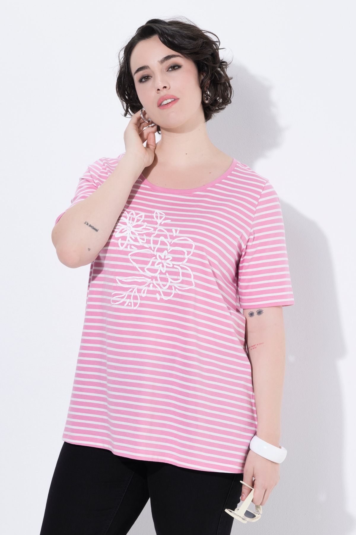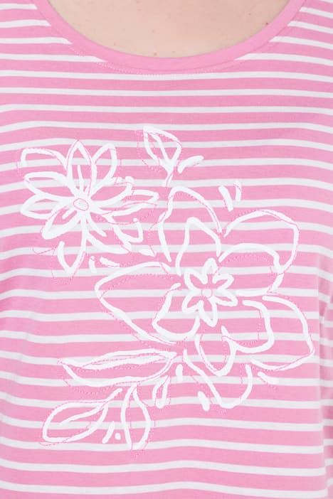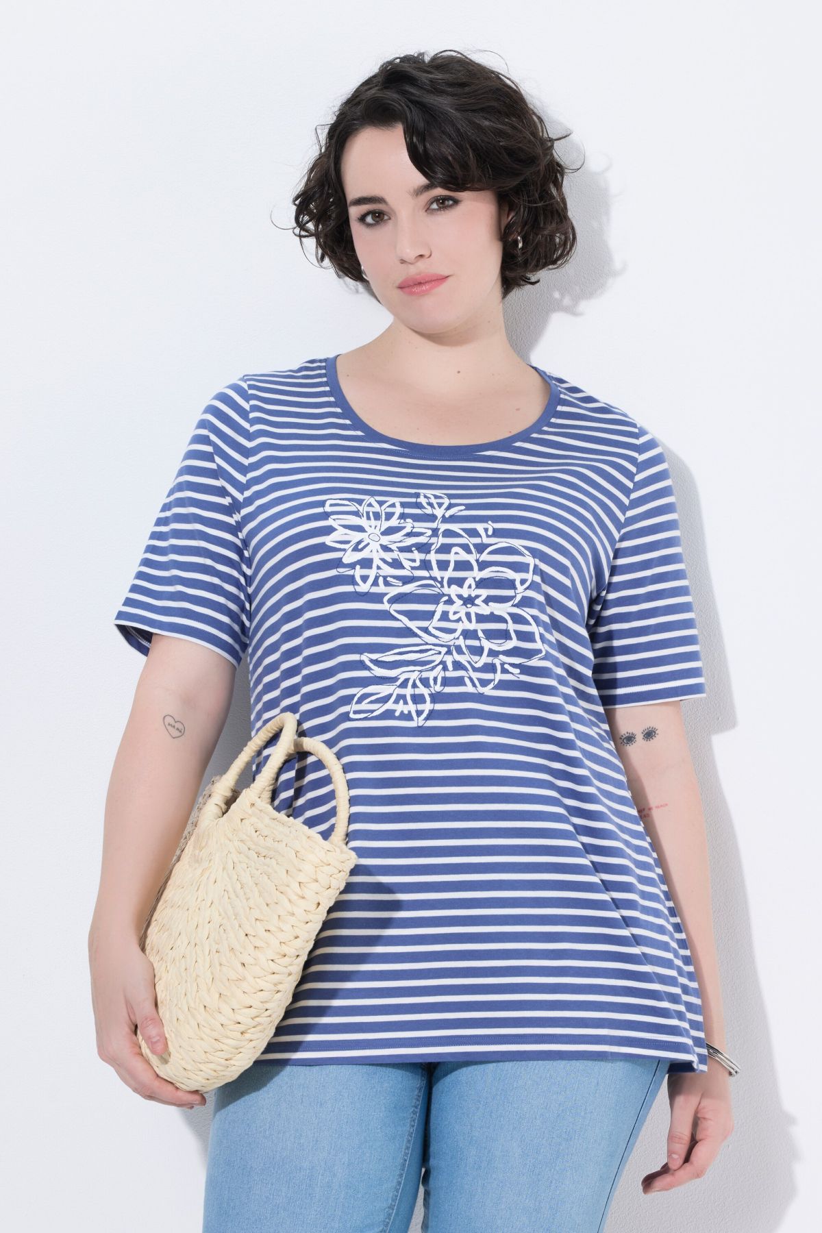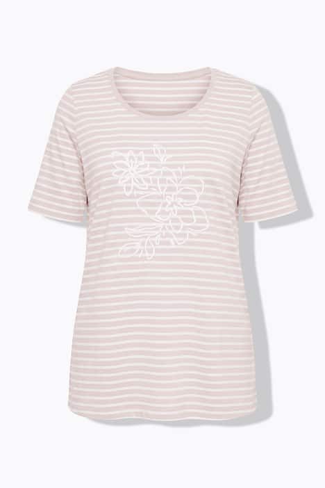 Rayures tendance avec fleurs brodées, Décolleté rond, Coupe évasée, base ample et confortable, Manches courtes, Pur coton, Long. selon taille env. 72-76 cm.