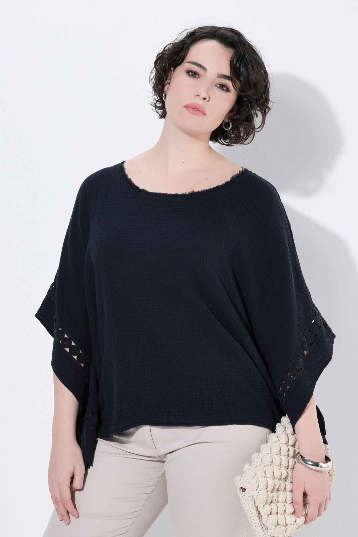 Mousseline raffinée, avec dentelle sur les côtés, Décolleté rond, Modèle oversize décontracté, Manches courtes, Pur coton, Long. selon taille env. 60-68 cm.