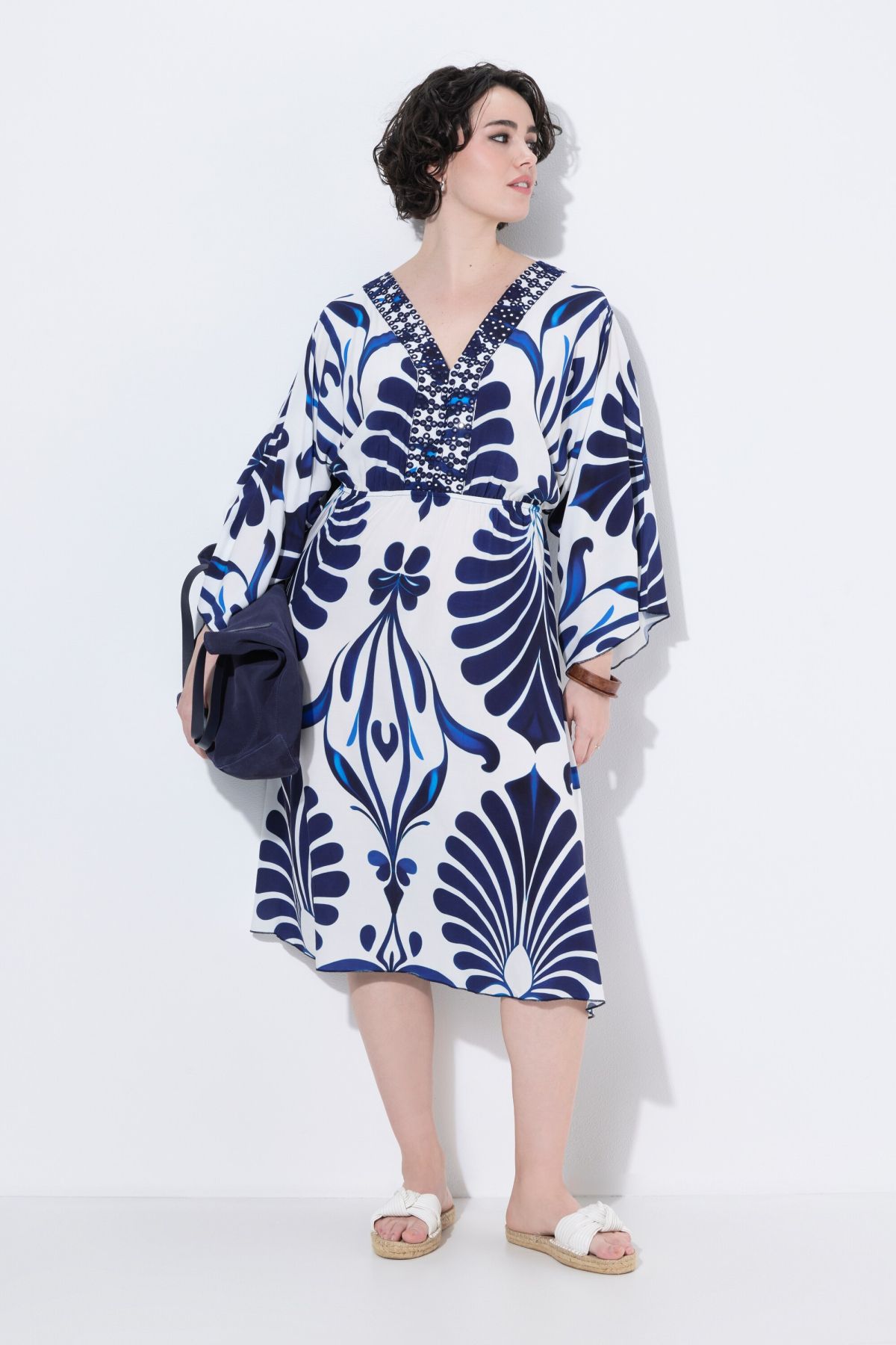 Acceuil Pré-commander Robes Robes midi Robe décolleté en V et manches 3/4, imprimé et petites pierres fantaisie