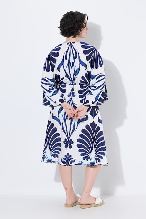 Imprimé élégant avec de grands motifs, Décolleté en V, large bordure agrémentée de petites pierres fantaisie, Coupe évasée, base ample et confortable, Manches 3/4, Matière au tombé fluide, Long. env. 110-114 cm.