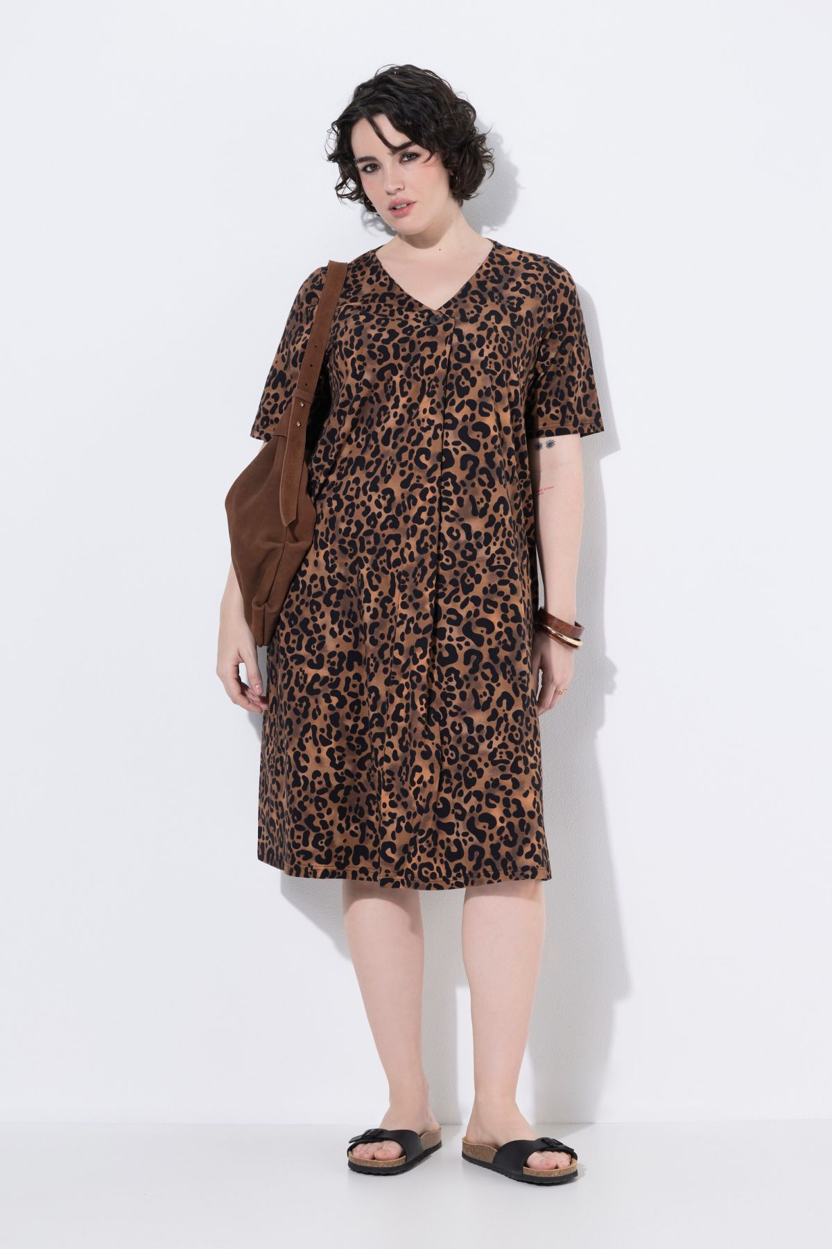 Jersey doux et confortable, imprimé tendance, Décolleté en V avec bouton et pli fantaisie, Coupe évasée, base ample et confortable, Poches sur les côtés, Coton naturel enrichi en élasthanne, Long. env. 100-104 cm.