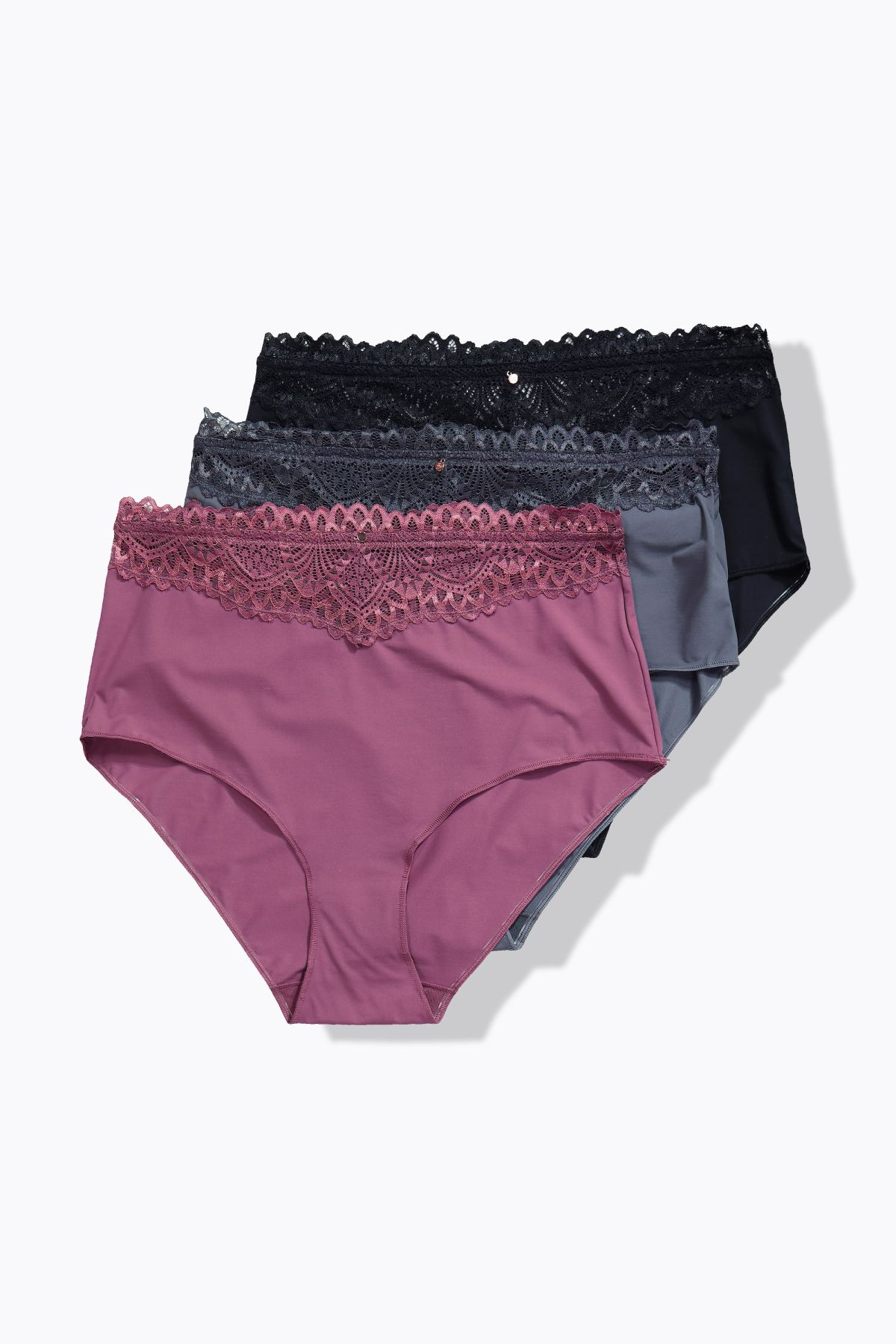3 culottes maxi en pack éco, Dentelle transparente à la taille, Modèle couvrant les fesses, Hauteur sur le côté : env. 18 cm (taille 44/46), Gousset en pur coton