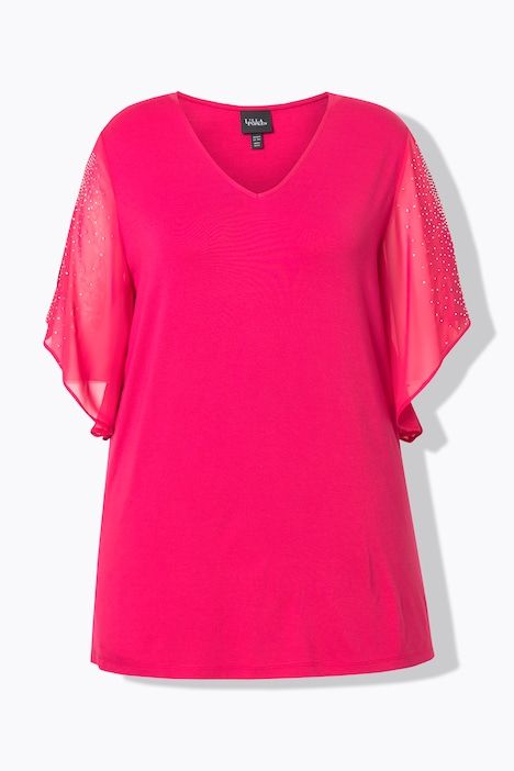 Petites strass raffinés sur les manches, Encolure en V, Coupe évasée confortable, Manches 3/4 fendues en mousseline, finition en biais, Jersey doux et confortable, Long. selon taille env. 72-76 cm.